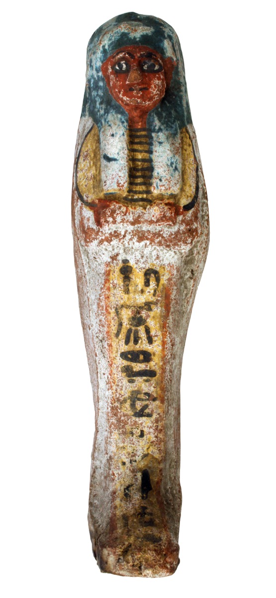 Glenn Janes (2018): 'Pottery shabti with a white wash and polychrome decoration. A vertical column of a black painted inscription upon a yellow ground is mostly illegible'.