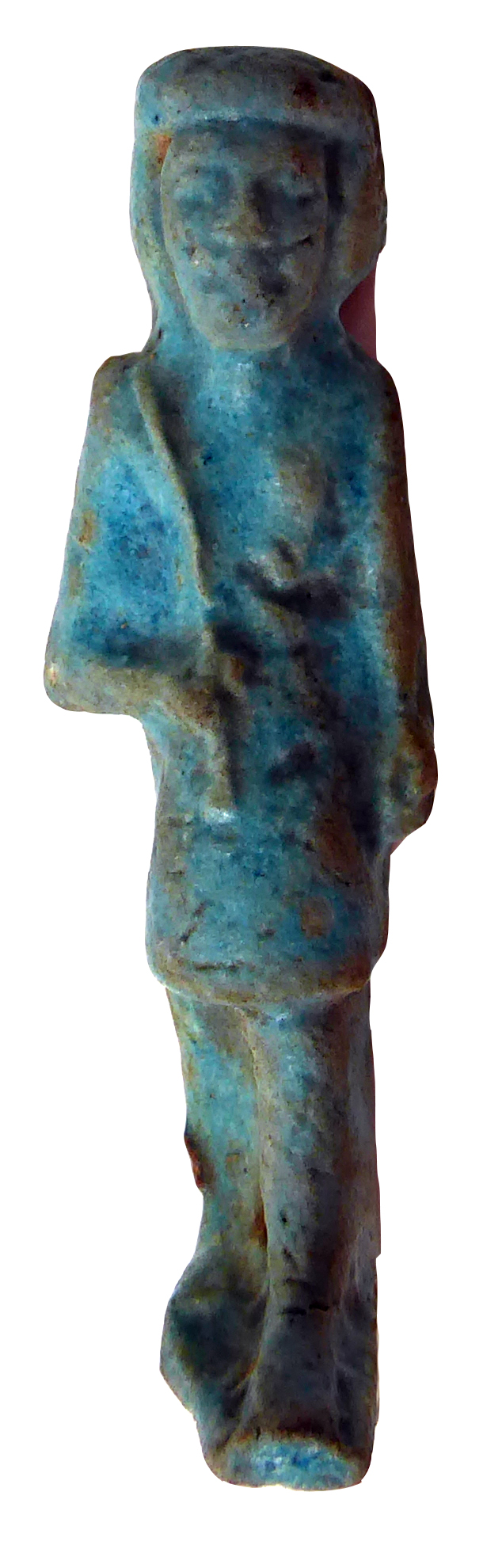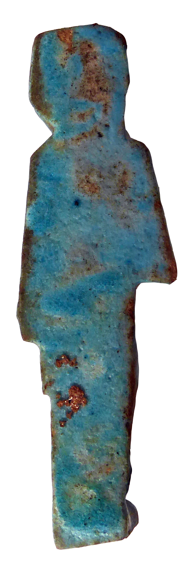 Glenn Janes (2018): 'Blue glazed faience overseer shabti striding with the left leg advanced. Flat backed.'
