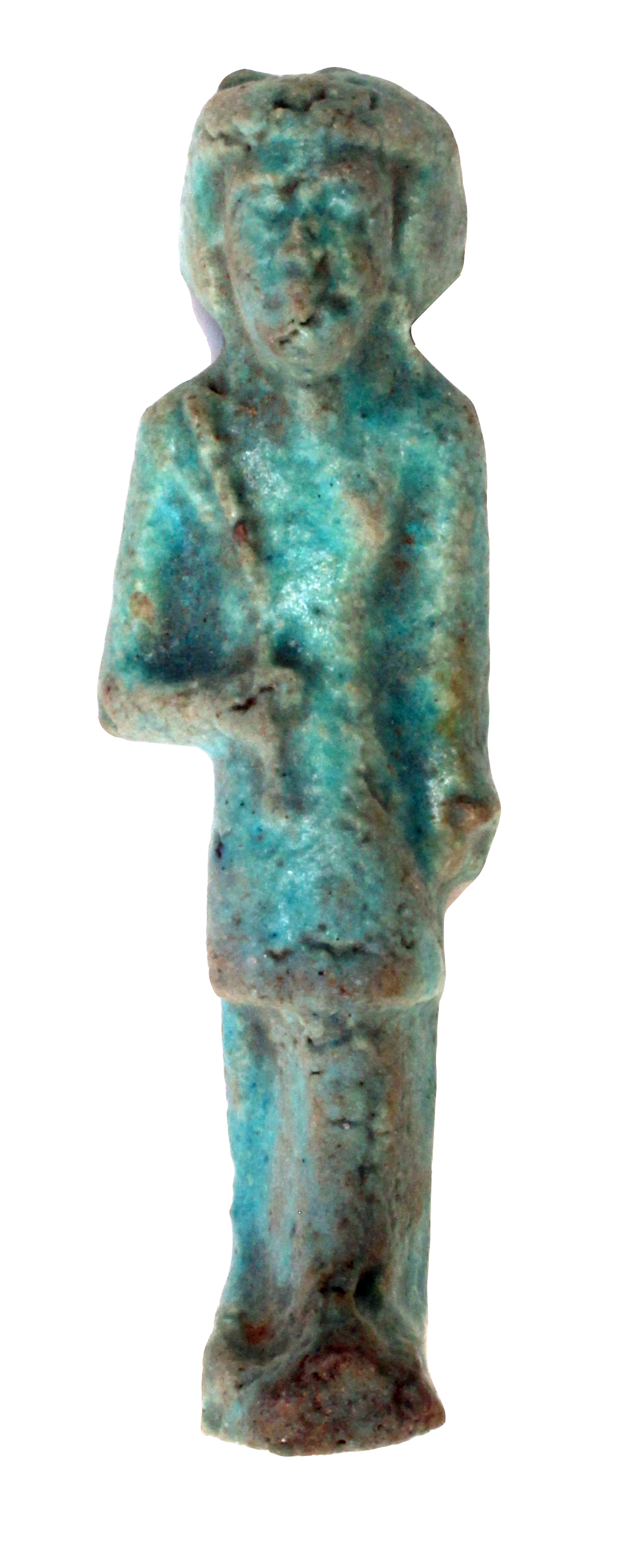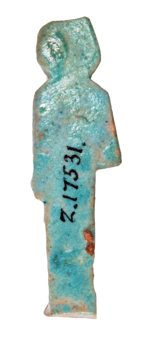 Glenn Janes (2018): 'Blue glazed faience 'overseer' shabti wearing a short skirt, and with the left leg advanced. A whip is modelled in relief and carried in the right hand. Flat-backed.'