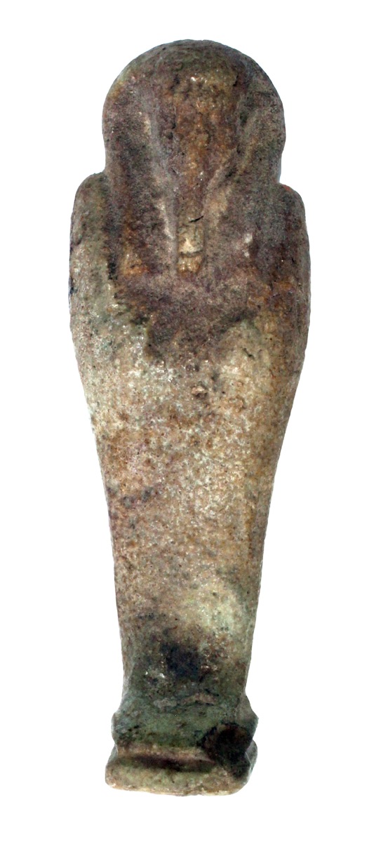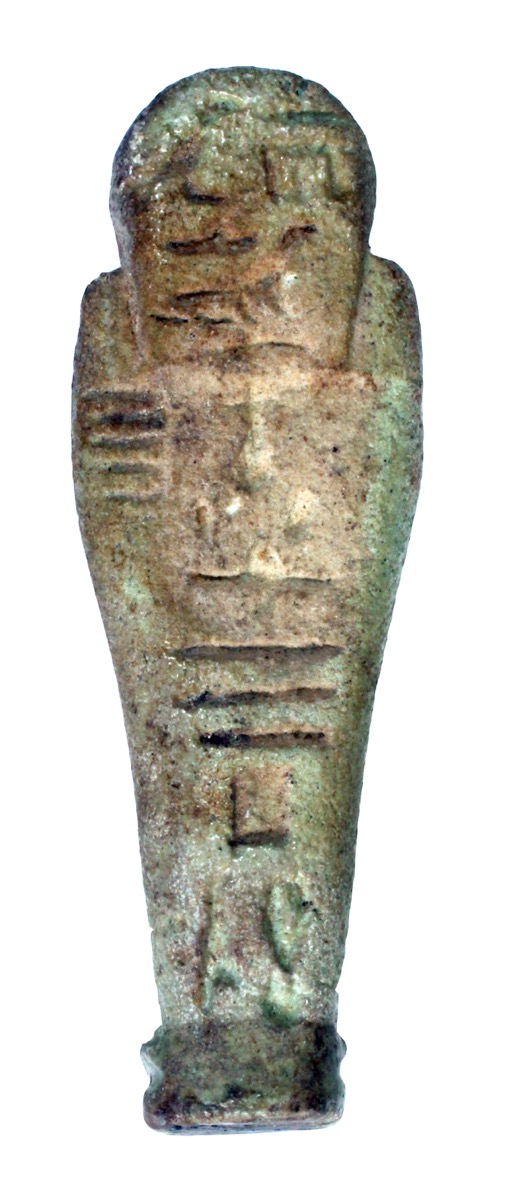 Green faience shabti, now faded to brown. Impressed inscription on reverse naming the owner as the ??, Hor-nefer, son of Hetep-tawy ..?