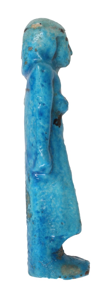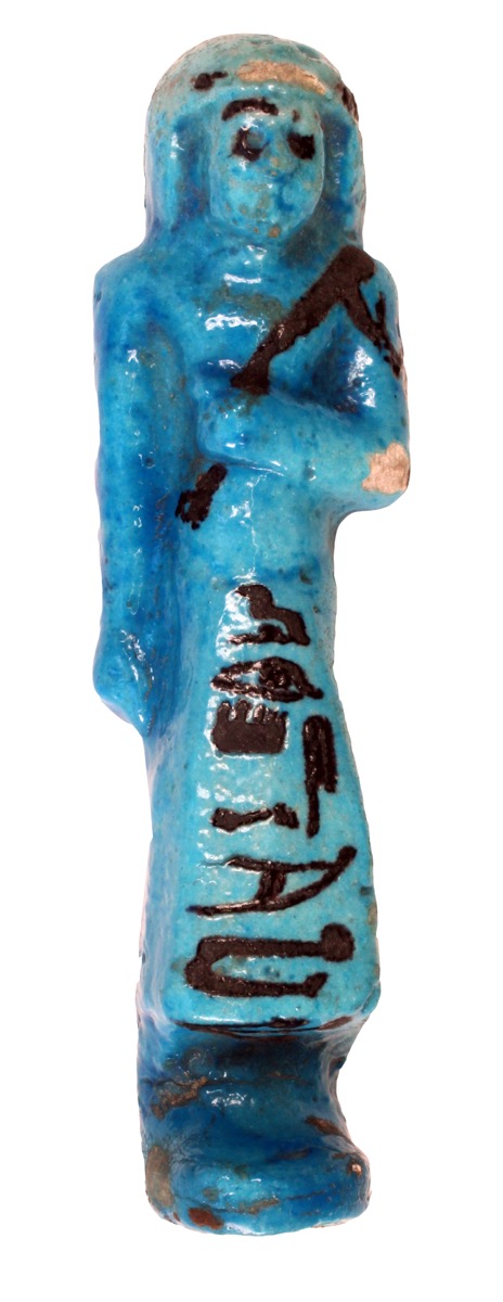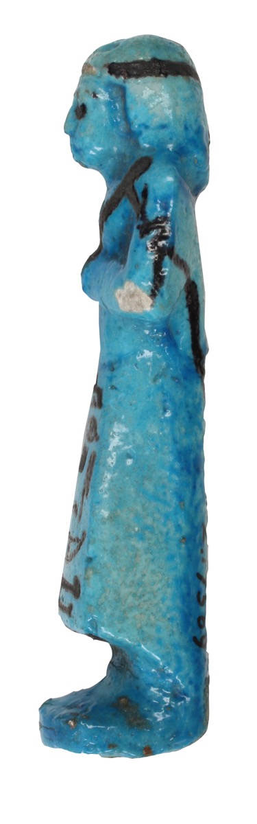 Bright blue faience 'overseer' shabti for Amen-mert, with details added in black. Chipped at left elbow and brow.