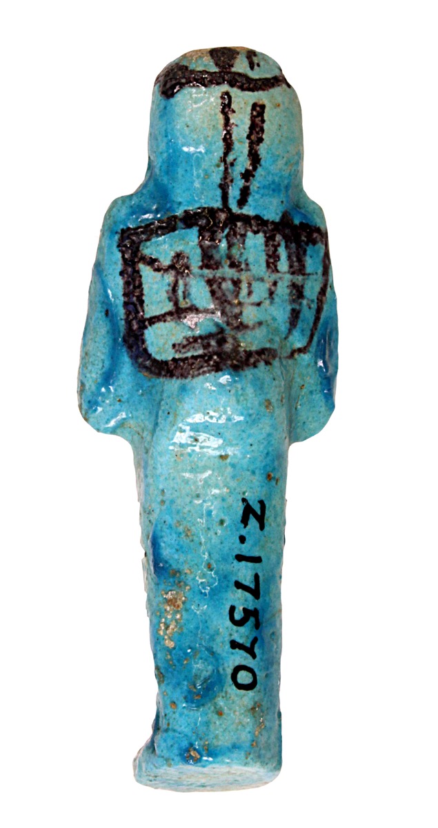 Bright blue faience shabti with details crudely added in black. A very large basket is painted on the back.