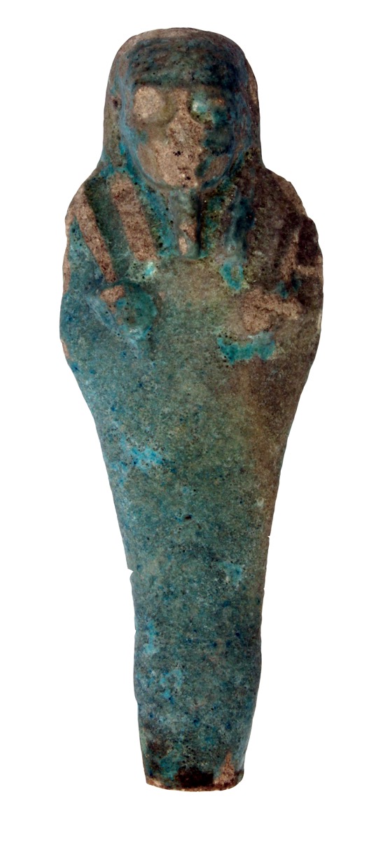 Blue faience uhabti (discoloured) without inscription. The feet are missing.