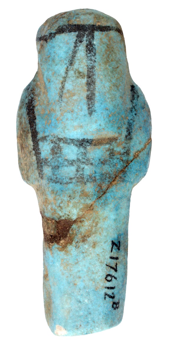Glenn Janes (2018): 'Blue glazed faience shabti with details added in black. The owner is named as Mut.'