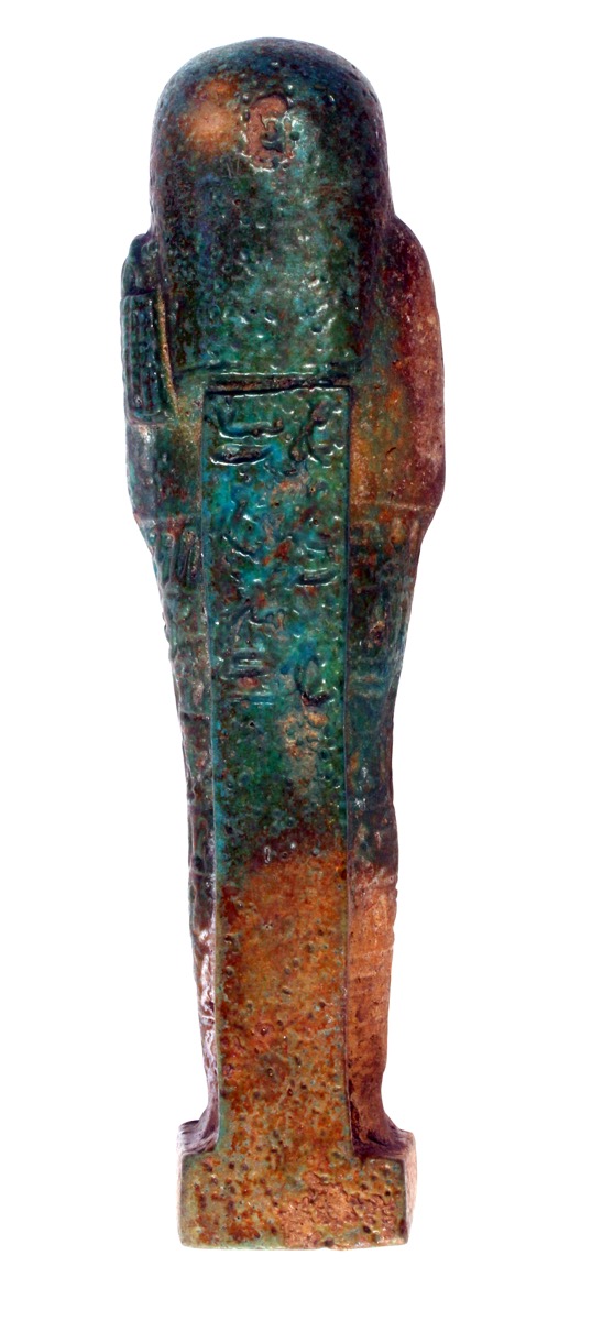 Deep blue-green faience shabti (discoloured). The inscription on the body and the back pillar is Chapter 6 of the Book of the Dead, but the name of the owner is illegible.