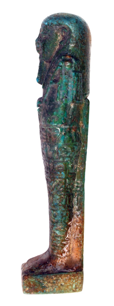 Glenn Janes (2018): 'Deep blue-green glazed ushabti (discoloured). The inscription is Chapter 6 of the Book of the Dead, but the name of the owner is illegible.'