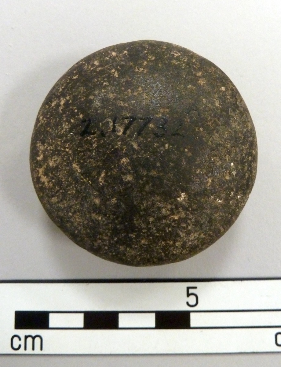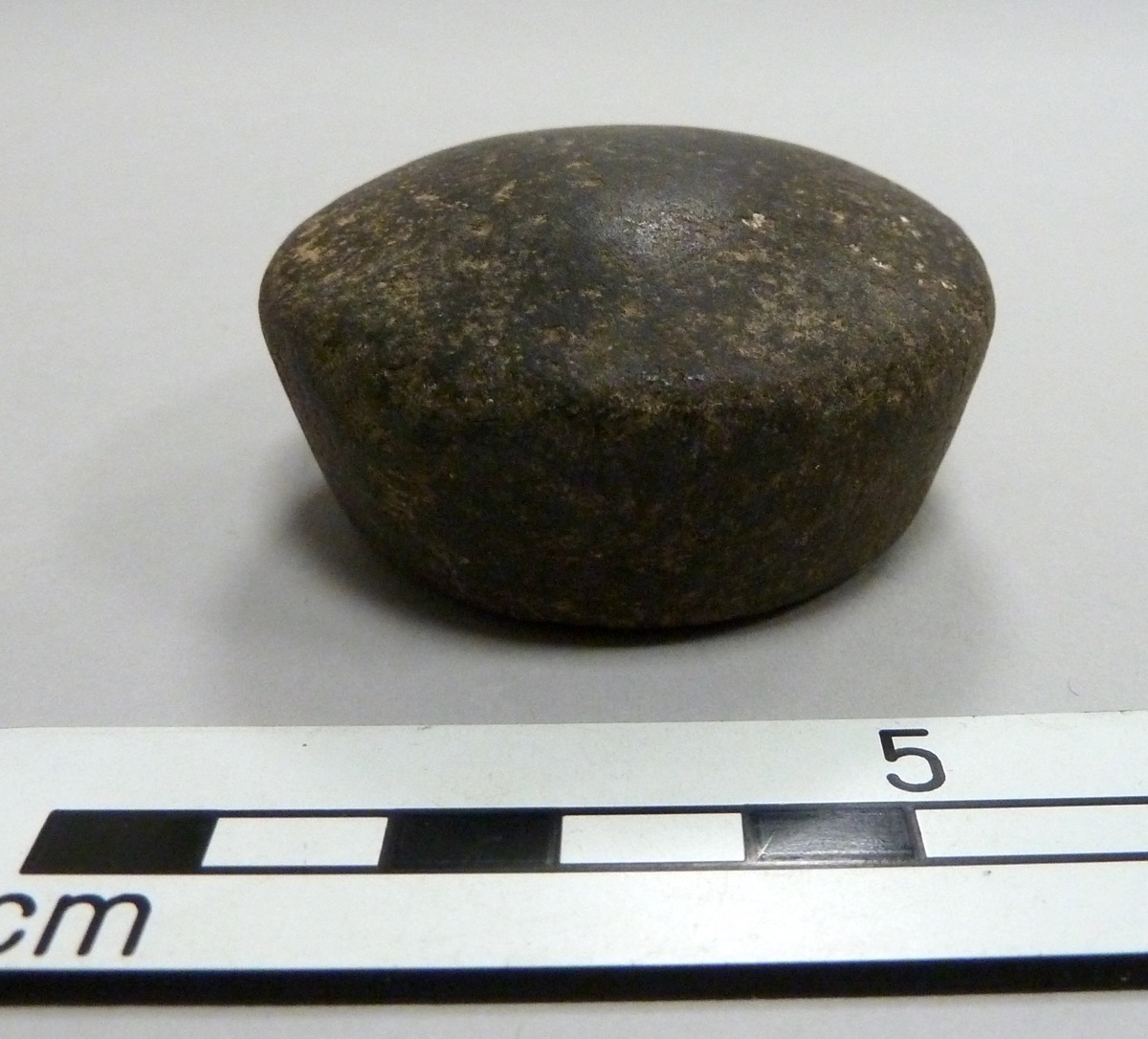 Stone, or basalt, weight. Flat base with a domed top.