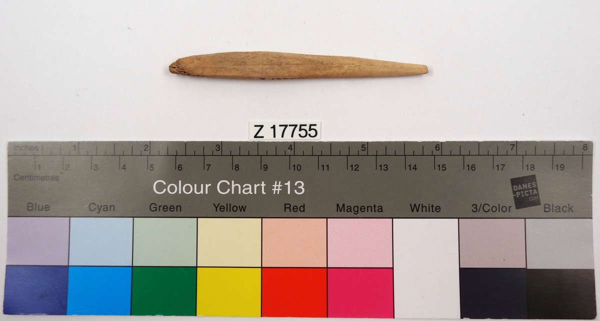 A bone tool, possibly have been used as an awl or pin. One end is clearly pointed but the tip blunted.