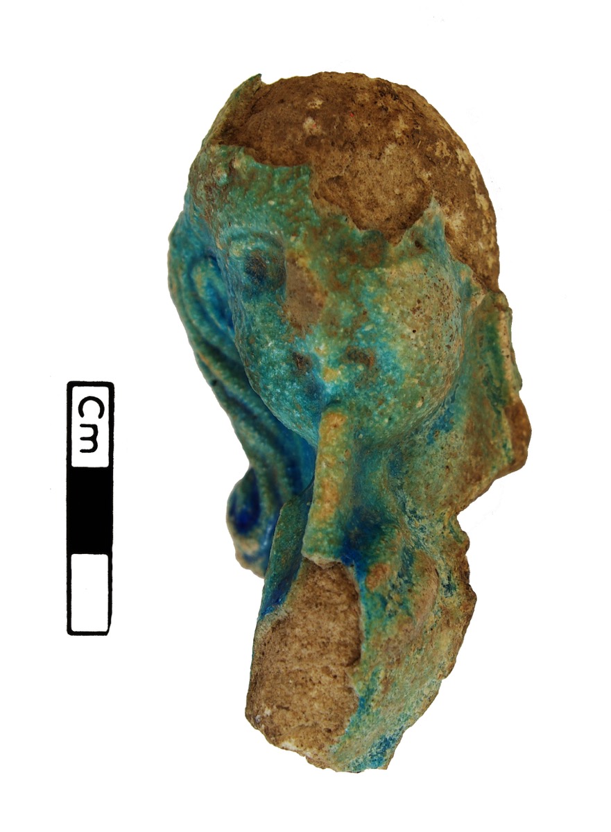 Faience head of Harpokrates with blue glaze, rest of body broken away and missing. Square slot through top of head.