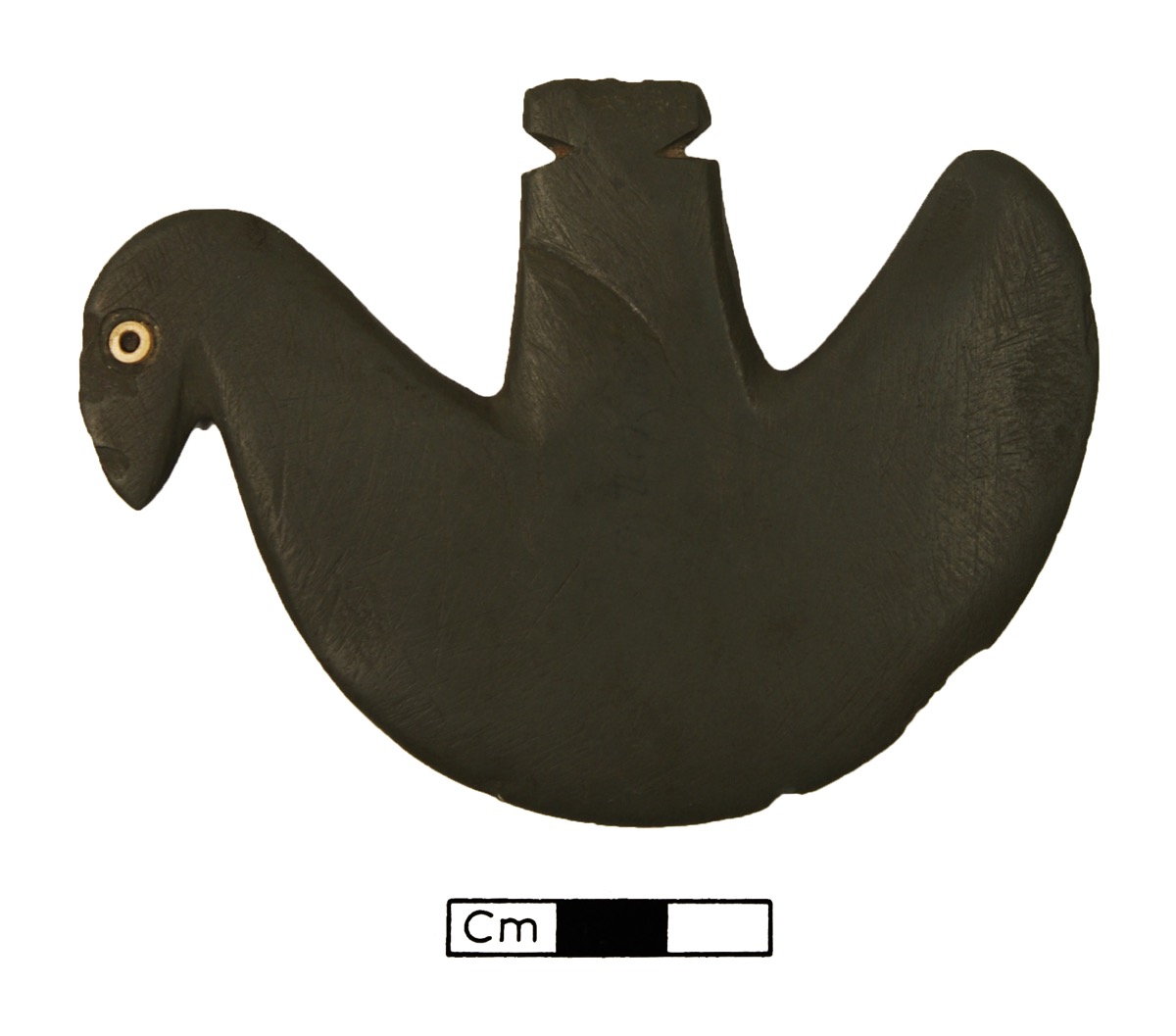 Slate bird form palette, birds' eyes inlaid with bone. One edge chipped.