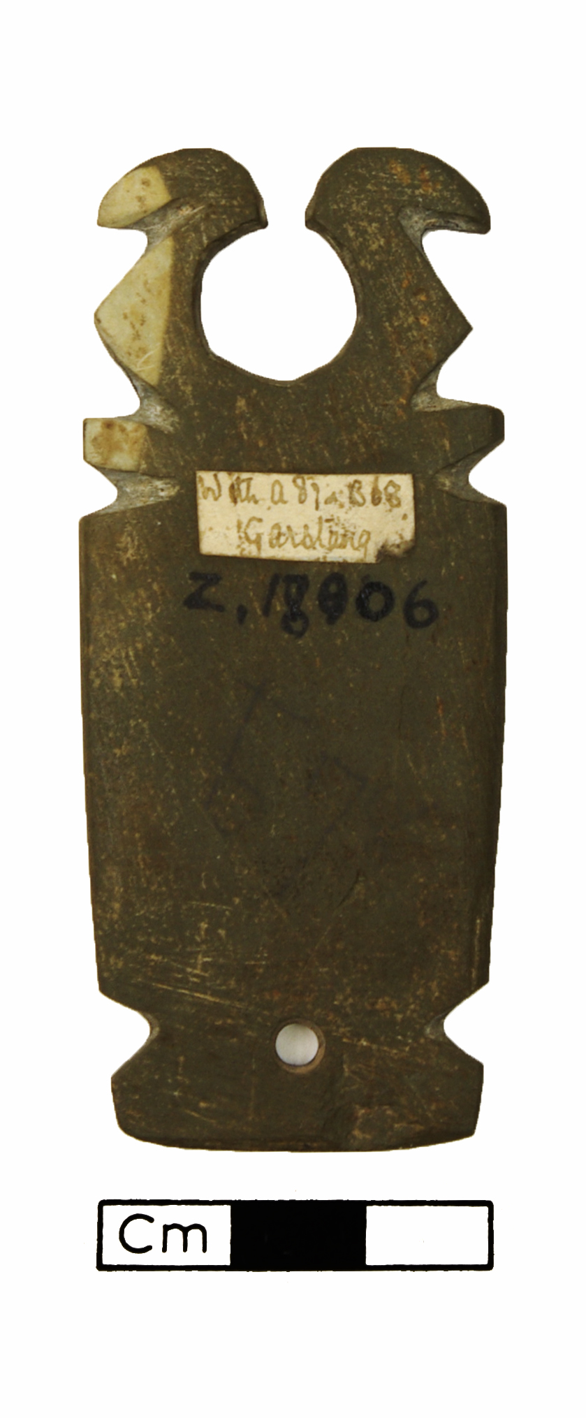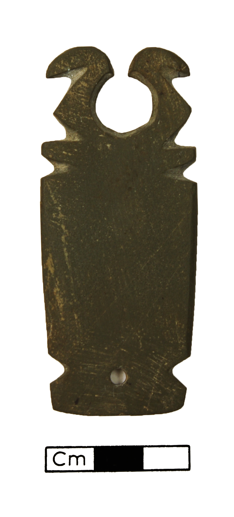 Miniature slate palette with double bird head, perforated at centre base.