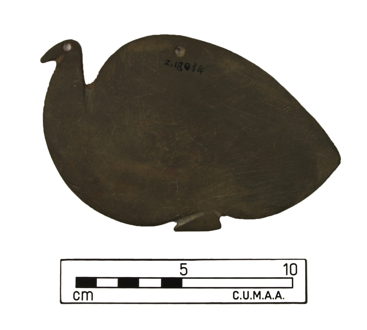 Ostrich Form Palette; Palette - In form of ostrich, perforation to form an eye, also perforation for suspension.