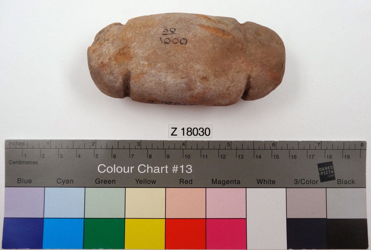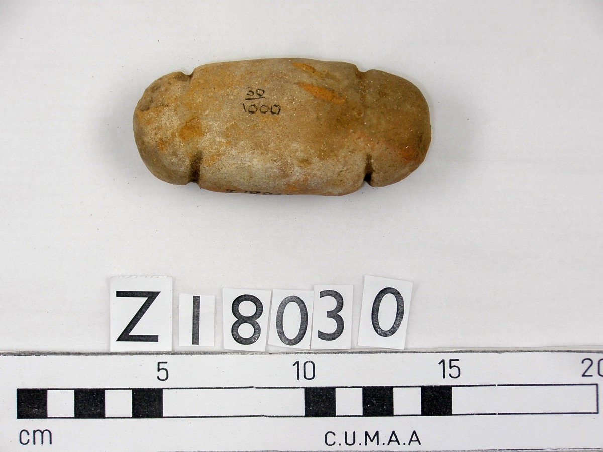 A sausage shaped weight or bobbin with a groove round either end possible for where string or thread to be wrapped round.