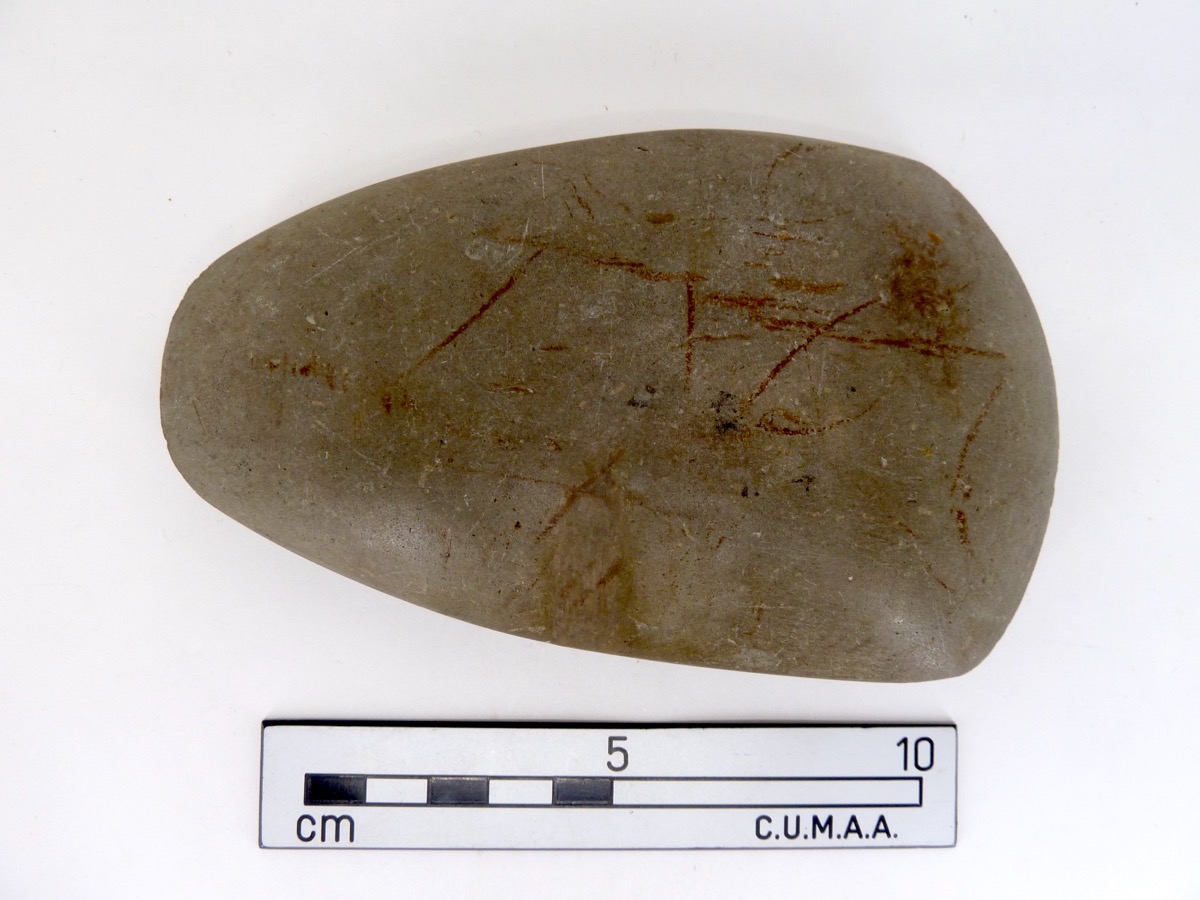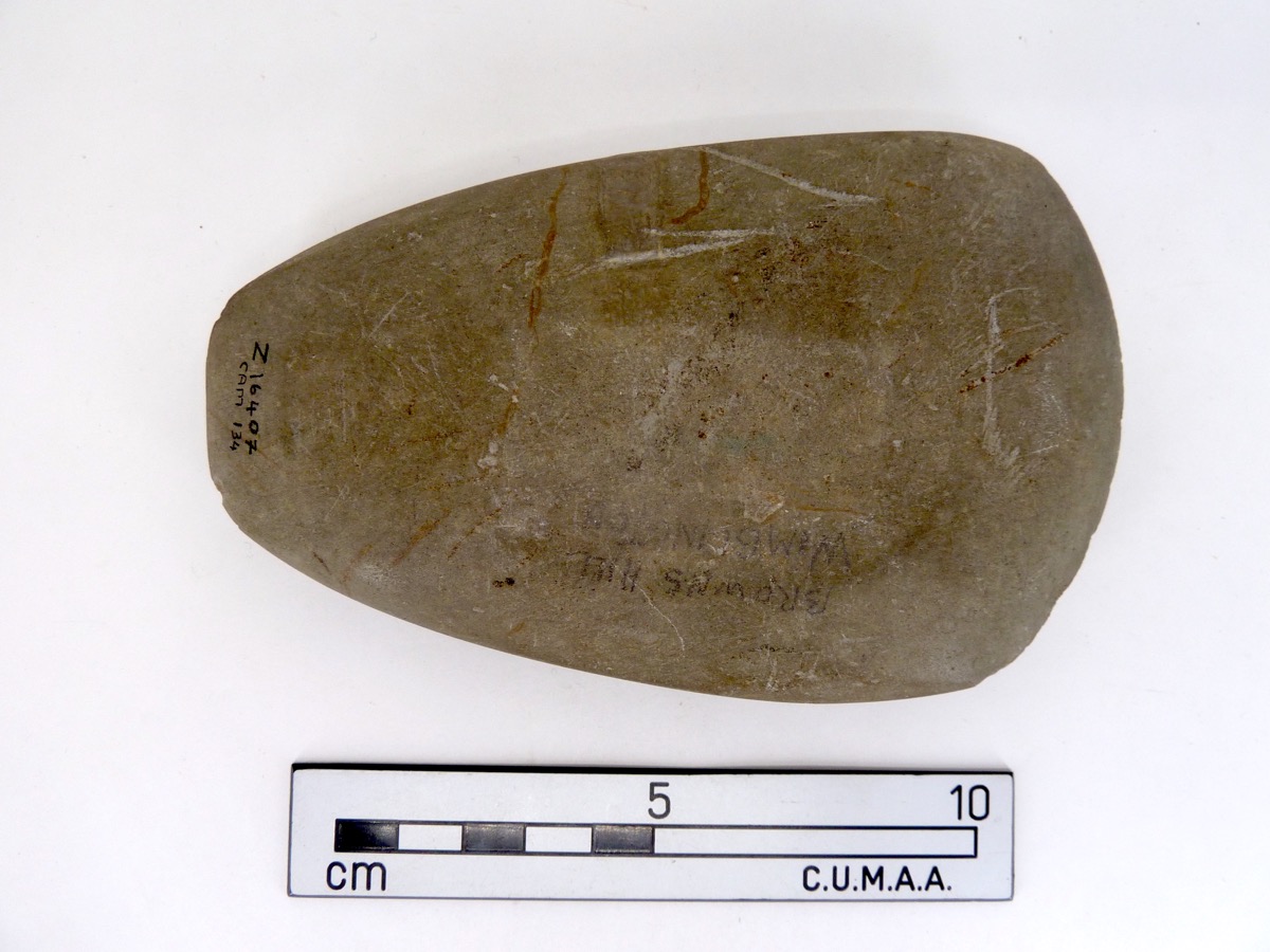 This axe was sampled as part of the Council for British Archaeology's Sub-Committee for Implement Petrology, at an unknown date. The subsequent analysis identified the stone as Group VII, augite granophyre, from the Penmaenmawr area, Caernarvonshire. See report in the archive (GO1/2/2).
