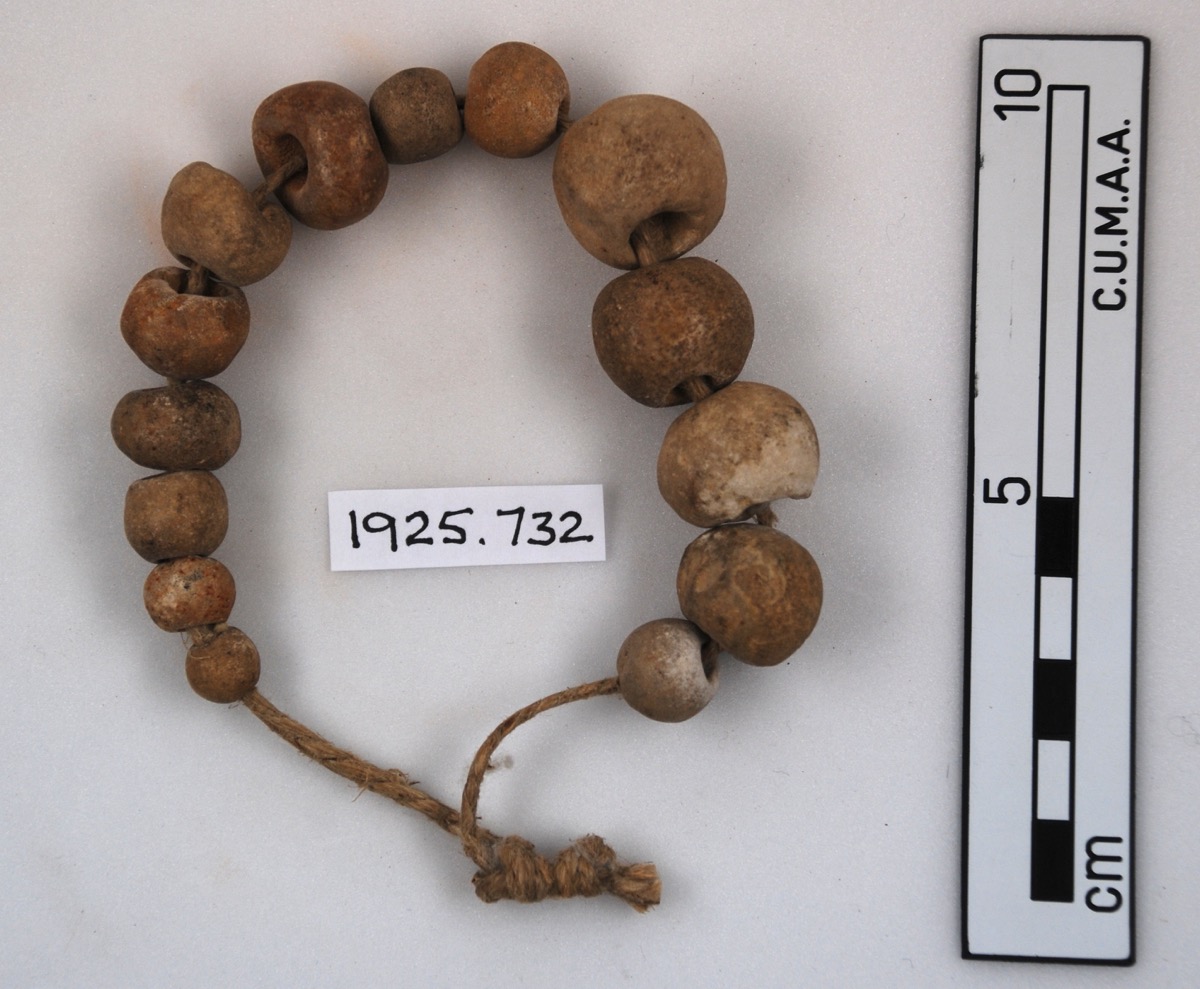 String of pierced ?fossilised sponges or shells. Small perforations on side. Porous