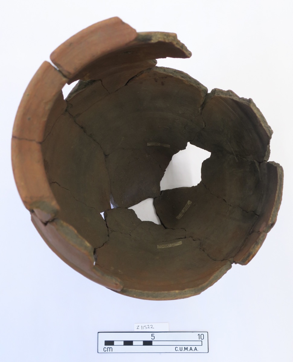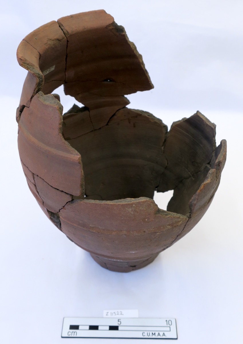 Original description for Z 11522 reads: 'A barrel-shaped urn with raised cordons. Red ware.'
