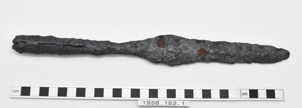 Iron socketed spearhead with an angular shoulder and faint mid-rib. Possible split socket with remains of mineralised wood.
