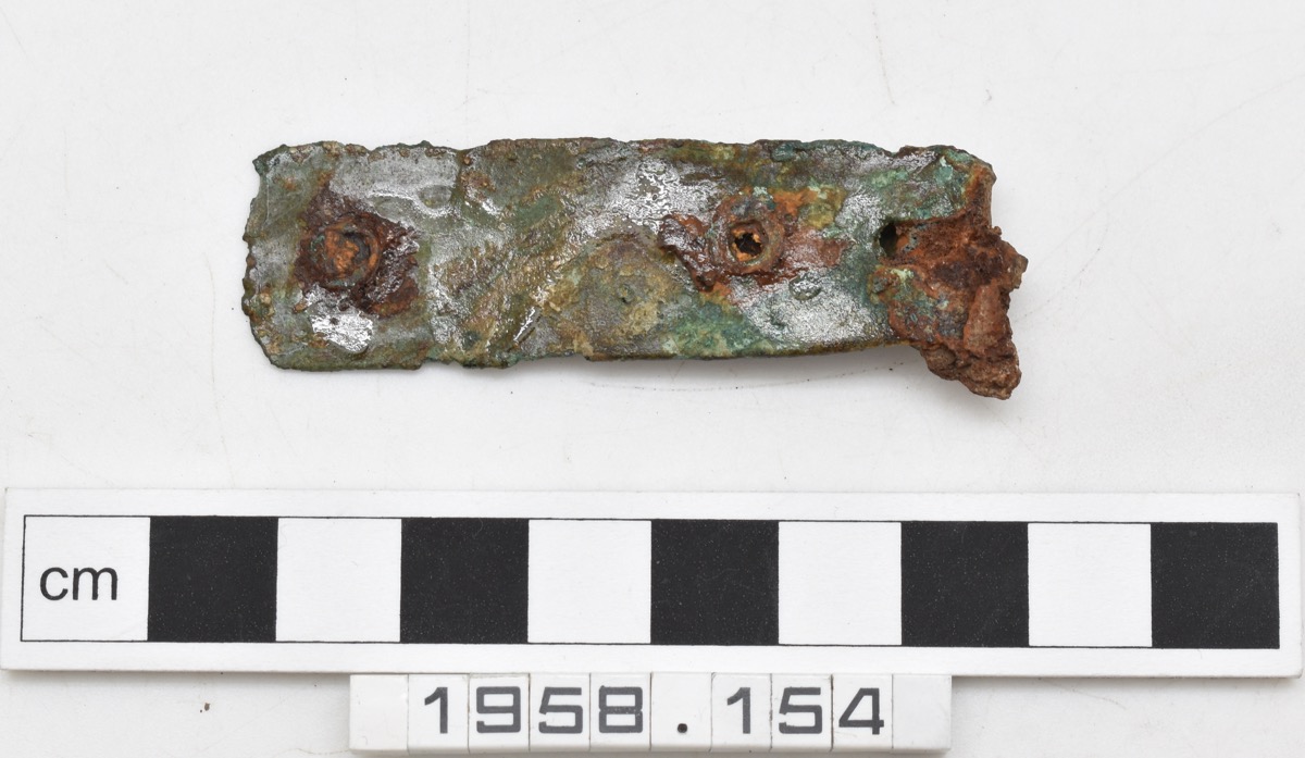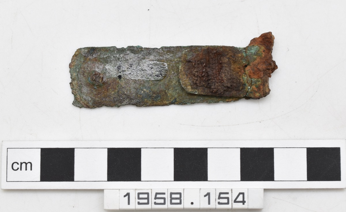 Sarah-Jane Harknett: 'Object is actually the bronze chape from a buckle. Part of the iron buckle remains. The holes for the two rivets are present, but no rivets.'
