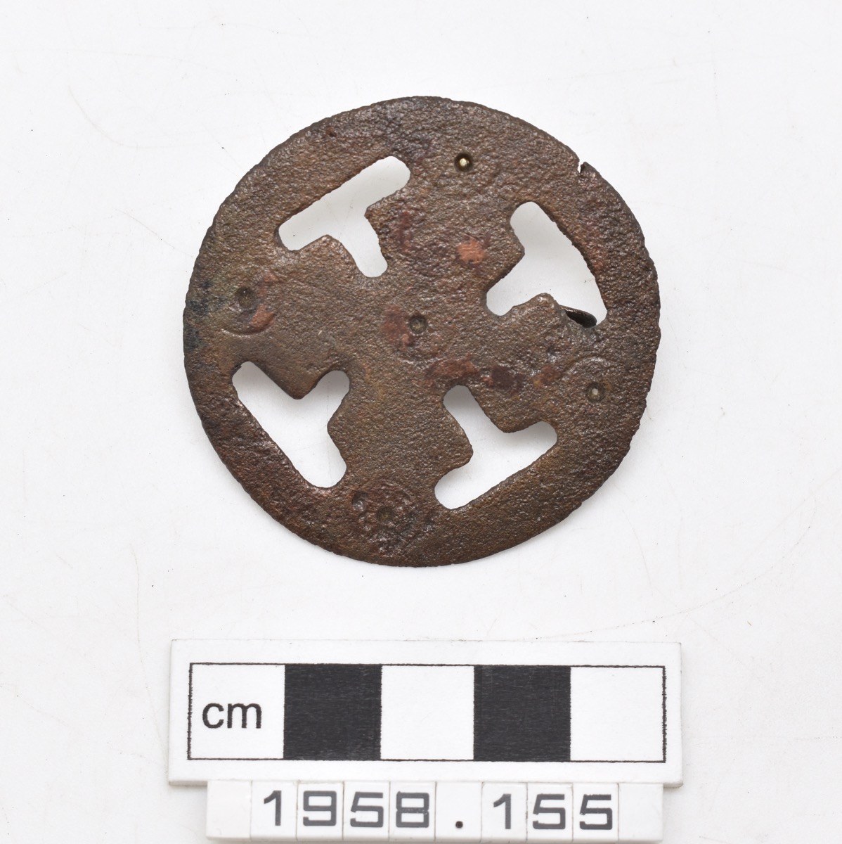 Copper alloy openwork disc brooch with for T-shaped cut outs and five ring and dot motifs; one at the centre, the others inbetween the cut outs. Pin bar lug and catchplate are fully intact.