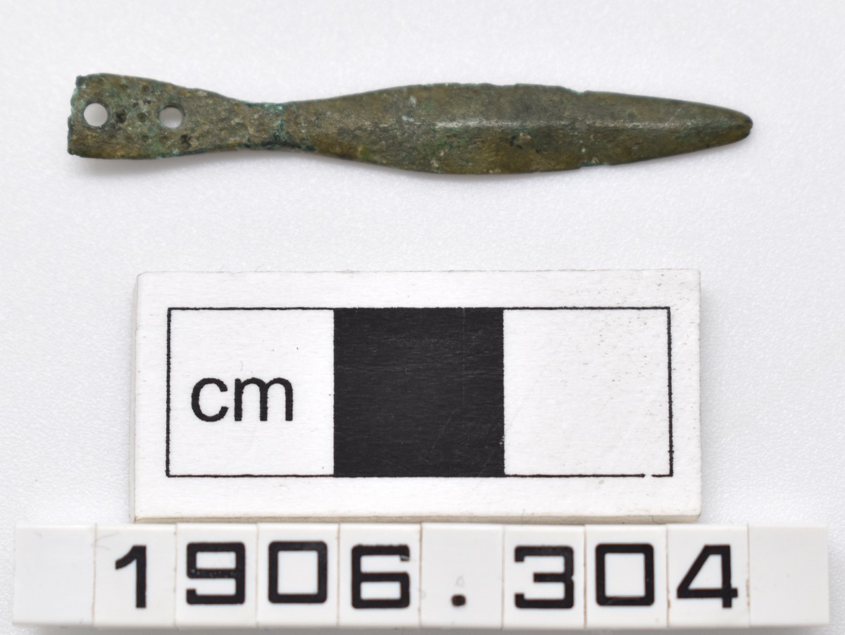 Miniature. A spear-shaped pendant or tang, the triangular base drilled with a couple of holes.