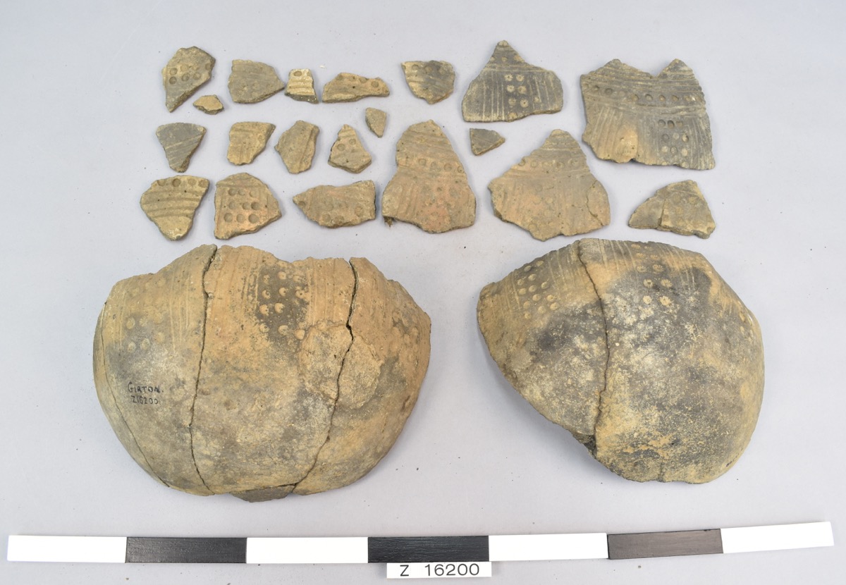 A pot, now in two large and 20 small sherds, decorated with a row of stamps framed by parallel grooves on the neck. Bosses alternate panels of stamps framed by parallel grooves; two stamp designs present. The two large sherds have been reconstructed from smaller sherds.