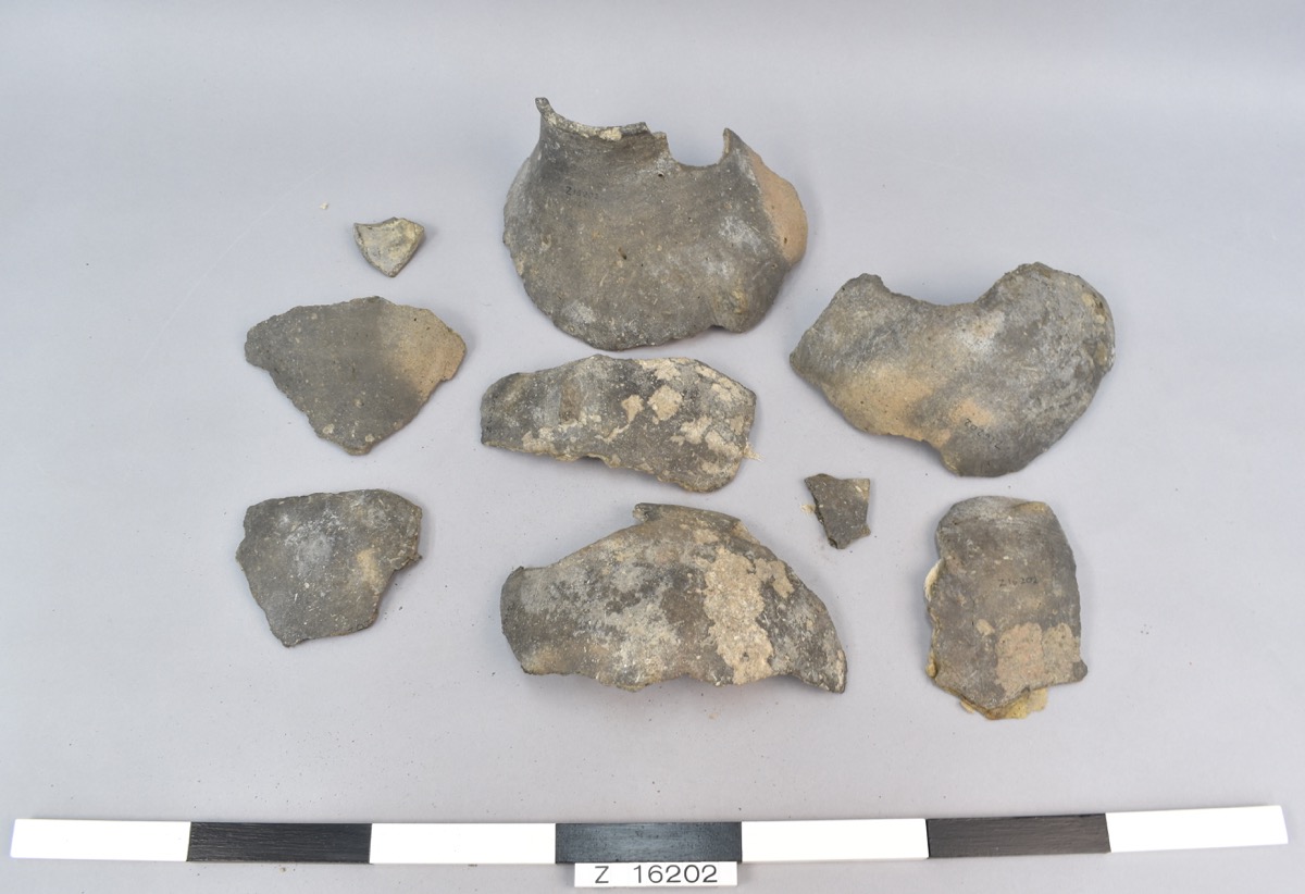Nine rim and body sherds from a pot with a narrow mouth and everted rim. The body is decorated with narrow, triangular, applied bosses on the shoulder. Possible heat spalling.