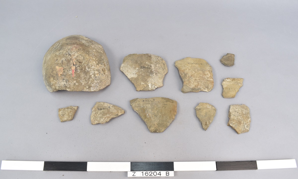 '10 sherds from one vessel. Decorated with stamps and horizontal bands of incised lines and stamped decoration. J. Somerville 8/5/2001'