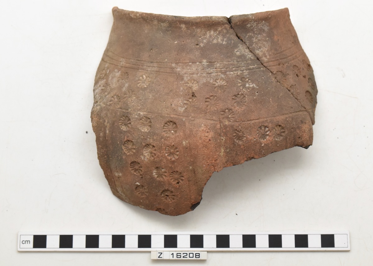 Tabitha Cotterill description: '17 sherds from one pot. Bosses, incised lines, stamped decoration'.