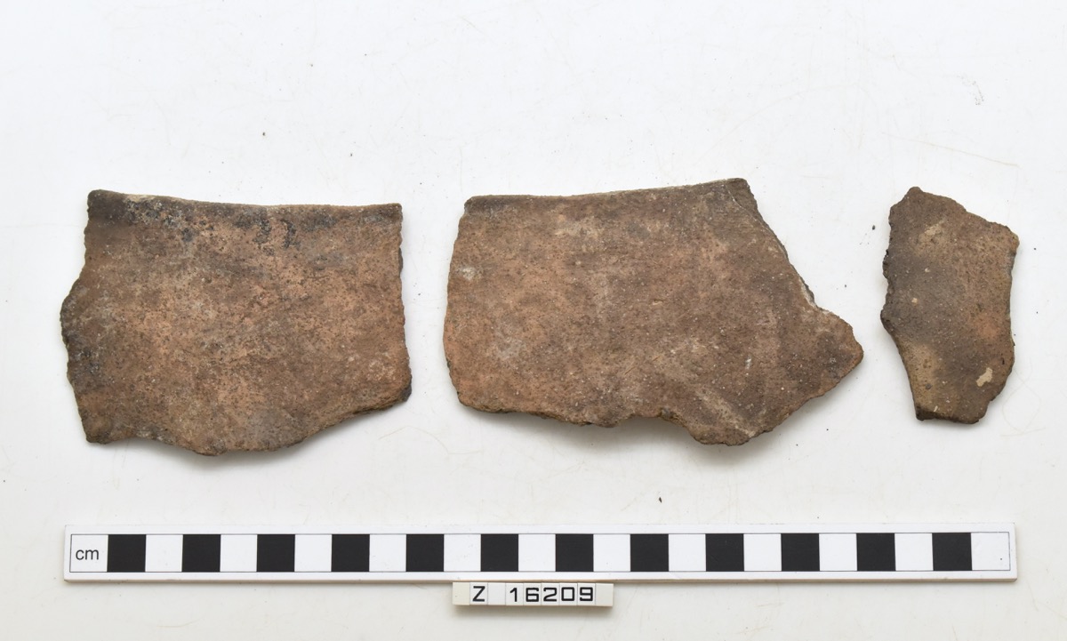 Incomplete, undecorated, globular pot with wide mouth, upright rim and flat base. Traces of textile on interior face of one base sherd, loose weave. Now in 26 sherds.