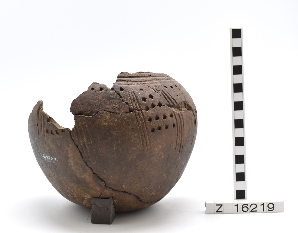 Incomplete globular pot with flat base. decorated with irregular horizontal grooves around the neck. Below which are groups of stamps intersected by clusters of vertical grooves. Possible heat spaling to lower body. Reconstructed, seven sherds detached but present.