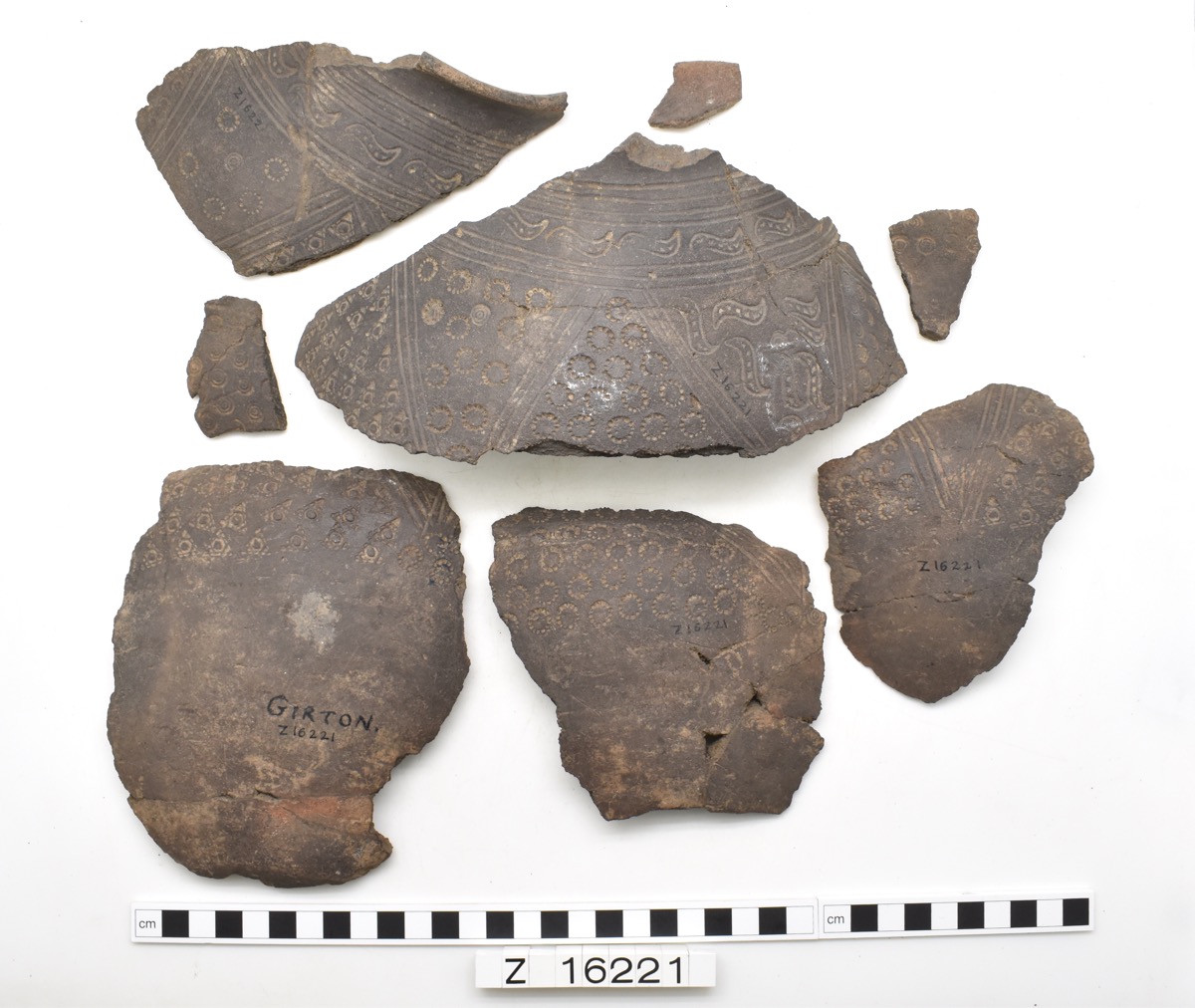 Incomplete pot with high shoulder, everted rim and flat base. Decorated with four parallel grooves around the neck, followed by a band of stamps and three further grooves. Below this is a band of three lined chevrons containing four different types of stamp. Eight sherds present.