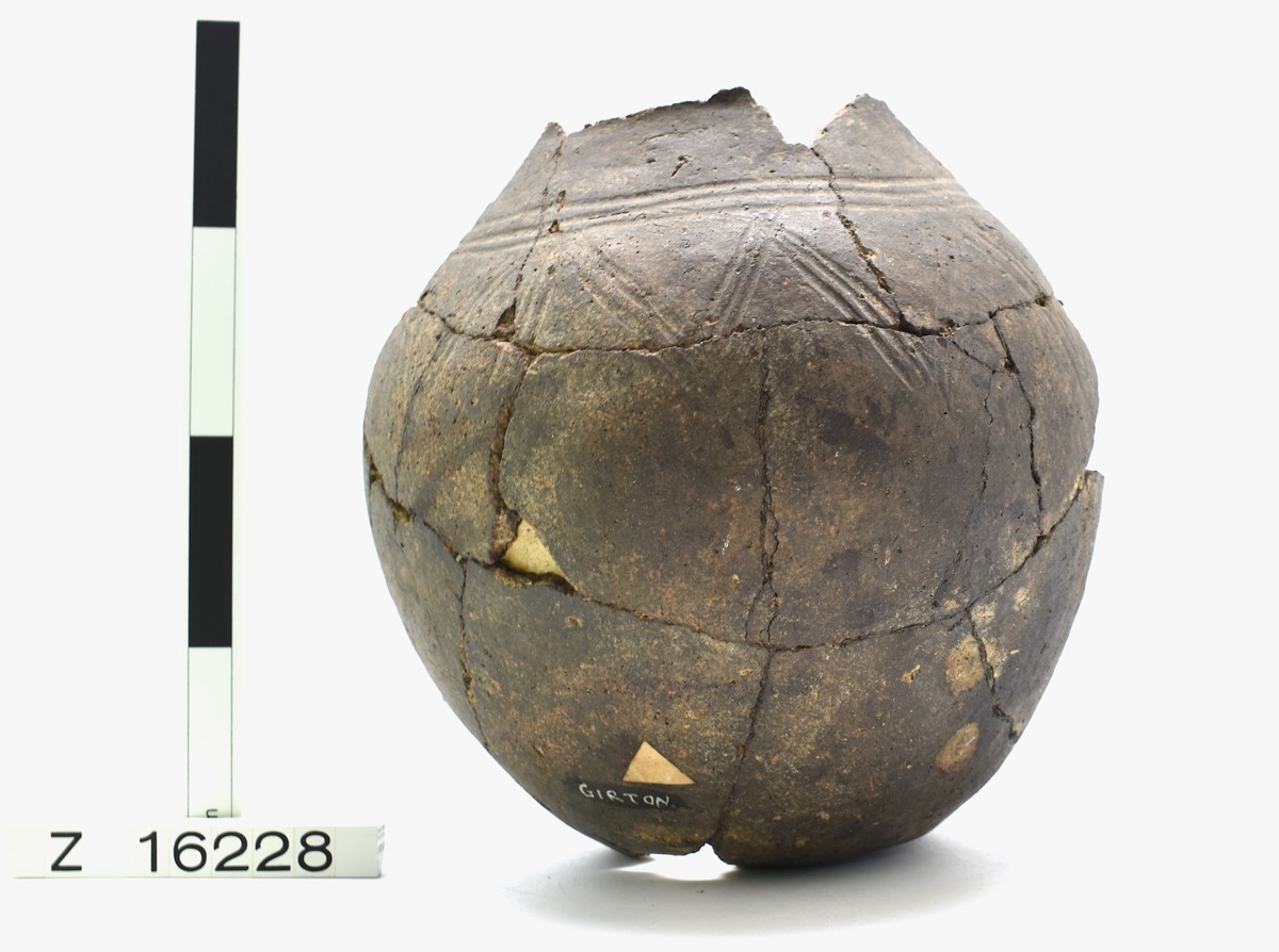 Globular pot with high neck and obtuse-angled, flat base. Decorated below neck with three parallel grooves, then three-lined pendant triangles. Eight sherds detached but present. partially reconstructed; rim missing, sections of body and base missing.