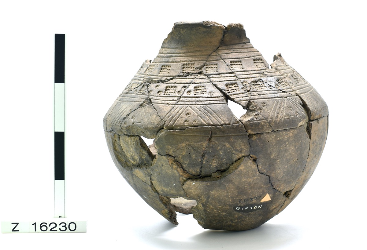 Kate Sutton:'Most of the rim, part of the body and the base broken off and missing. The pot is comprised of many sherds glued back together, there are two sherds broken off but present. The pot is decorated with incised lines, grooves and stamped decoration.'