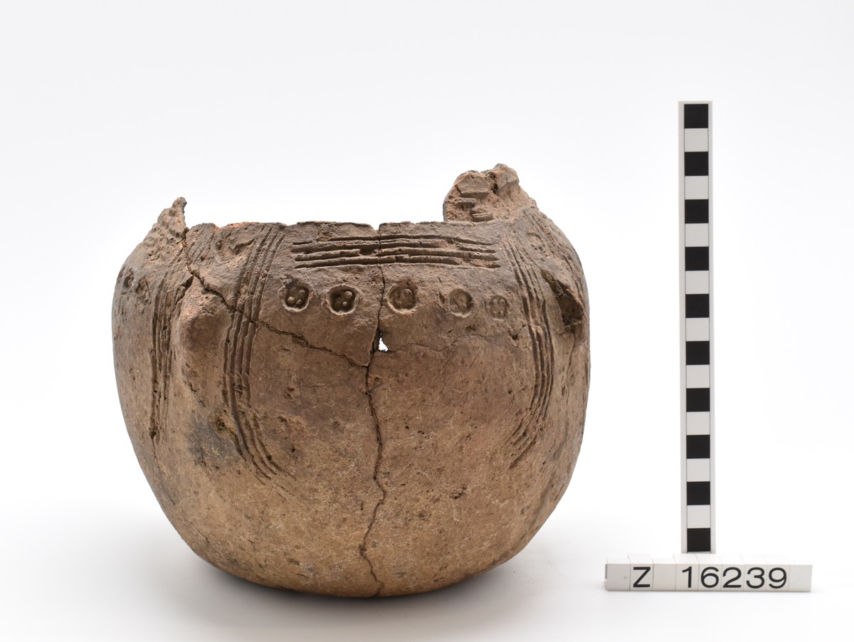 Incomplete globular pot with flat base. Decorated with vertical shoulder bosses with four vertical grooves on either side and a stamp above. Between these are bands of four horizontal grooves and a band of stamps. Reconstructed from sherds, three detached but present.