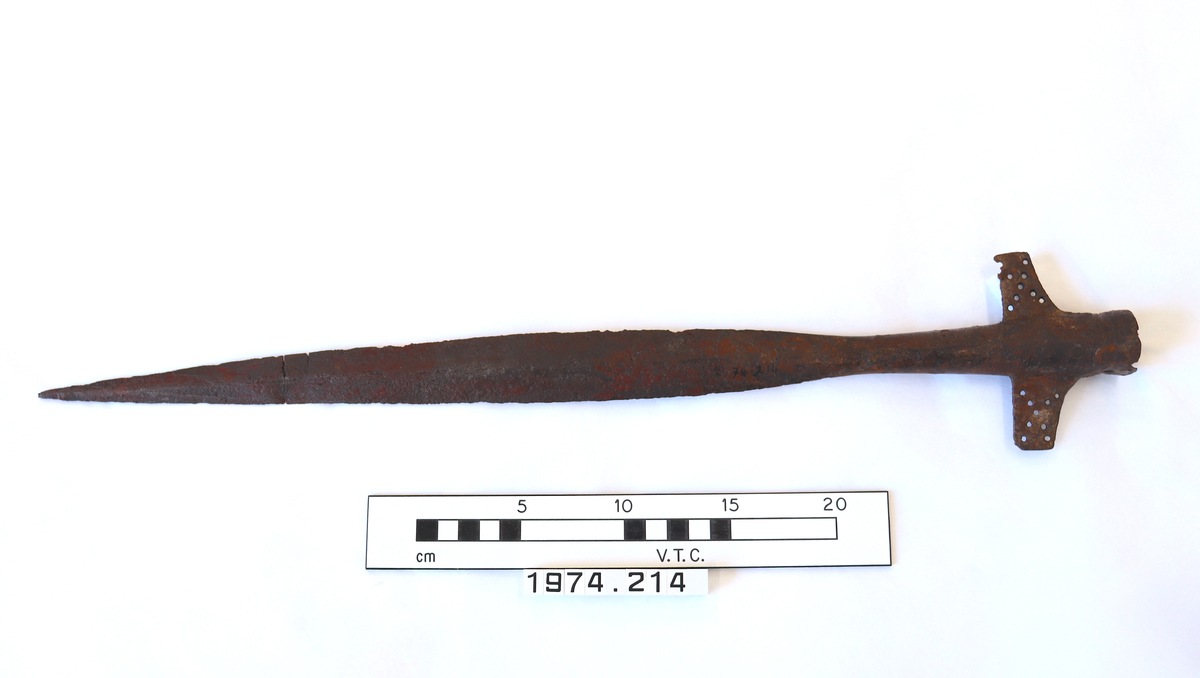 Socketed winged spearhead of iron. Leaf-shaped blade of pointed oval cross section. Wings both decorated with an 'X' of circular perforations. Blade possibly pattern welded.