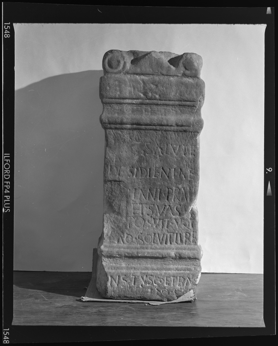 Stone altar with rectangular cross-section, straight sides, and flat base. Capital decorated with a spiral at each end with a triangular section in between; shaft framed by two sets of parallel horizontal lines at each end, with an inscription carved between on one face; opposite face has an unworked surface. One face also has a shorter inscription on the base. Inscription reads:'To Jupiter, Best and Greatest, for the welfare of Desidienius Aemilianus, prefect, both his own [and] his family's, [the dedicator] set this up and willingly fulfilled his vow in the consulship of Tuscus and Bassus.'
