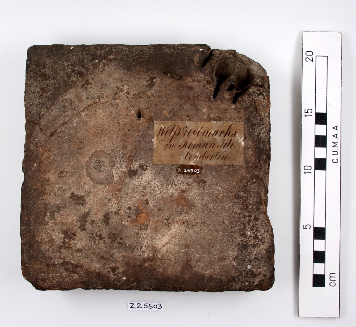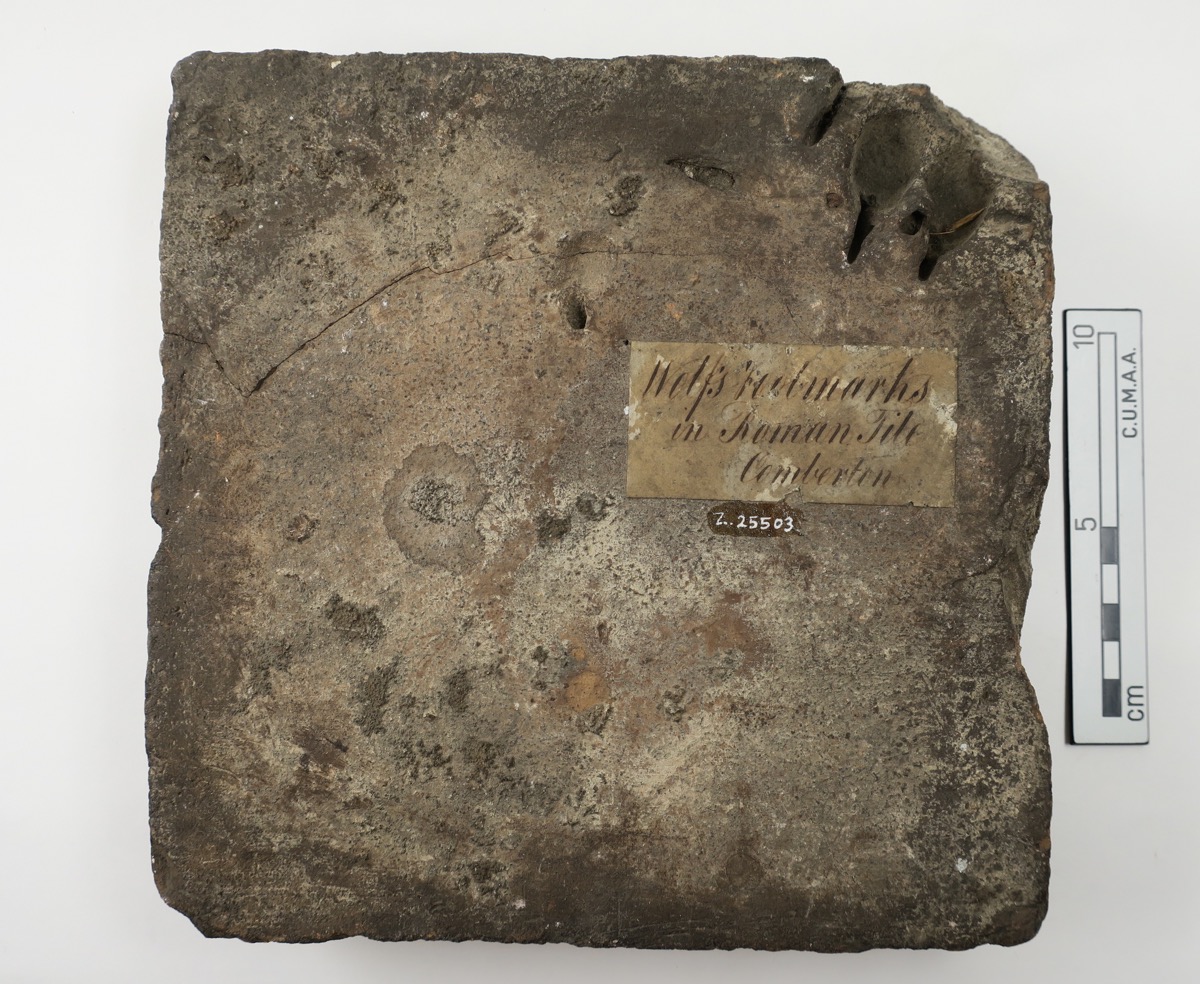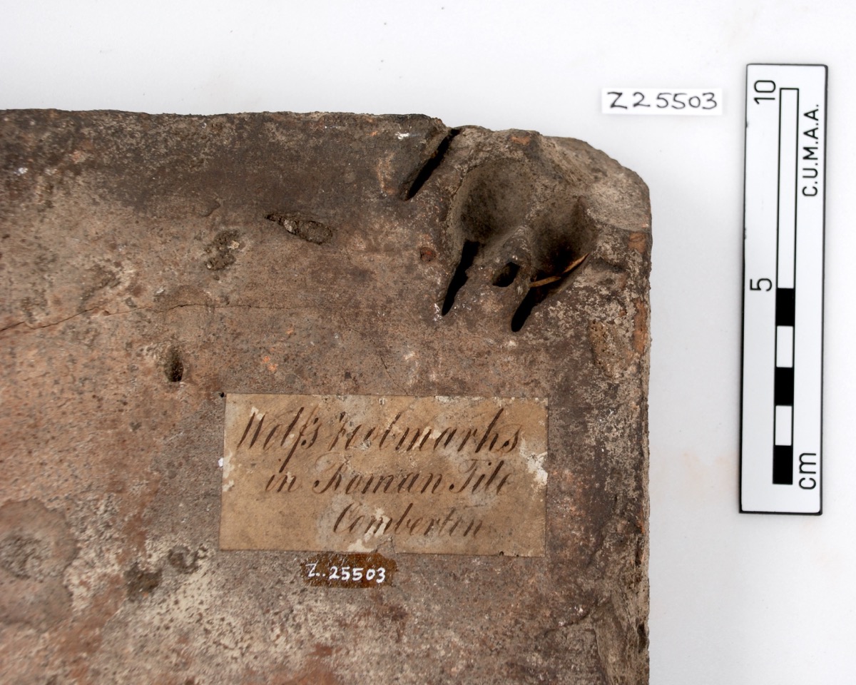 Handwritten label affixed to object reads: 'Wolf's Footmarks in Roman Tile'