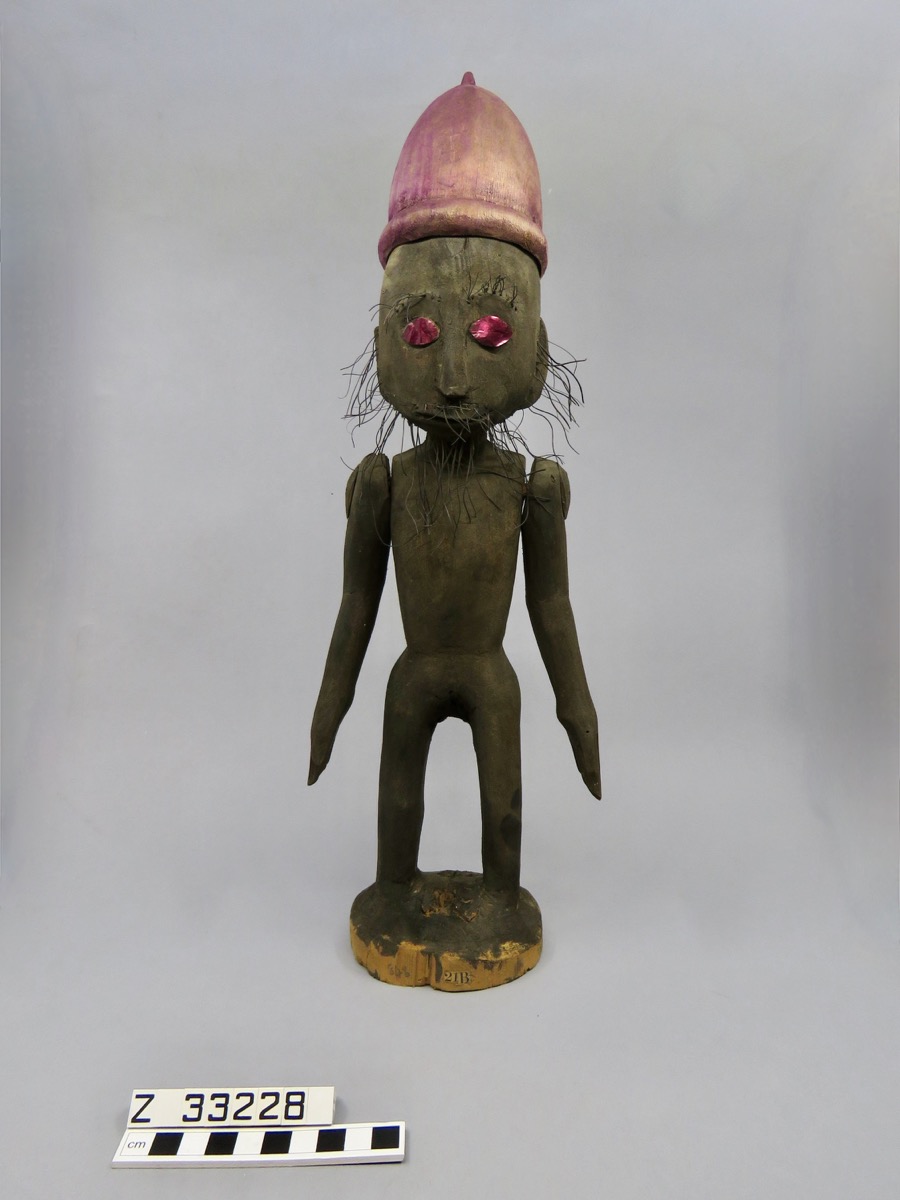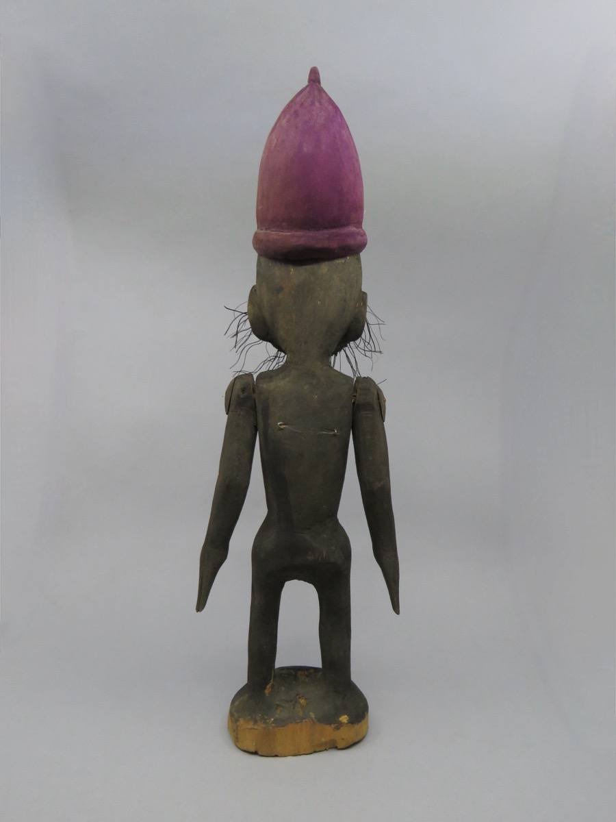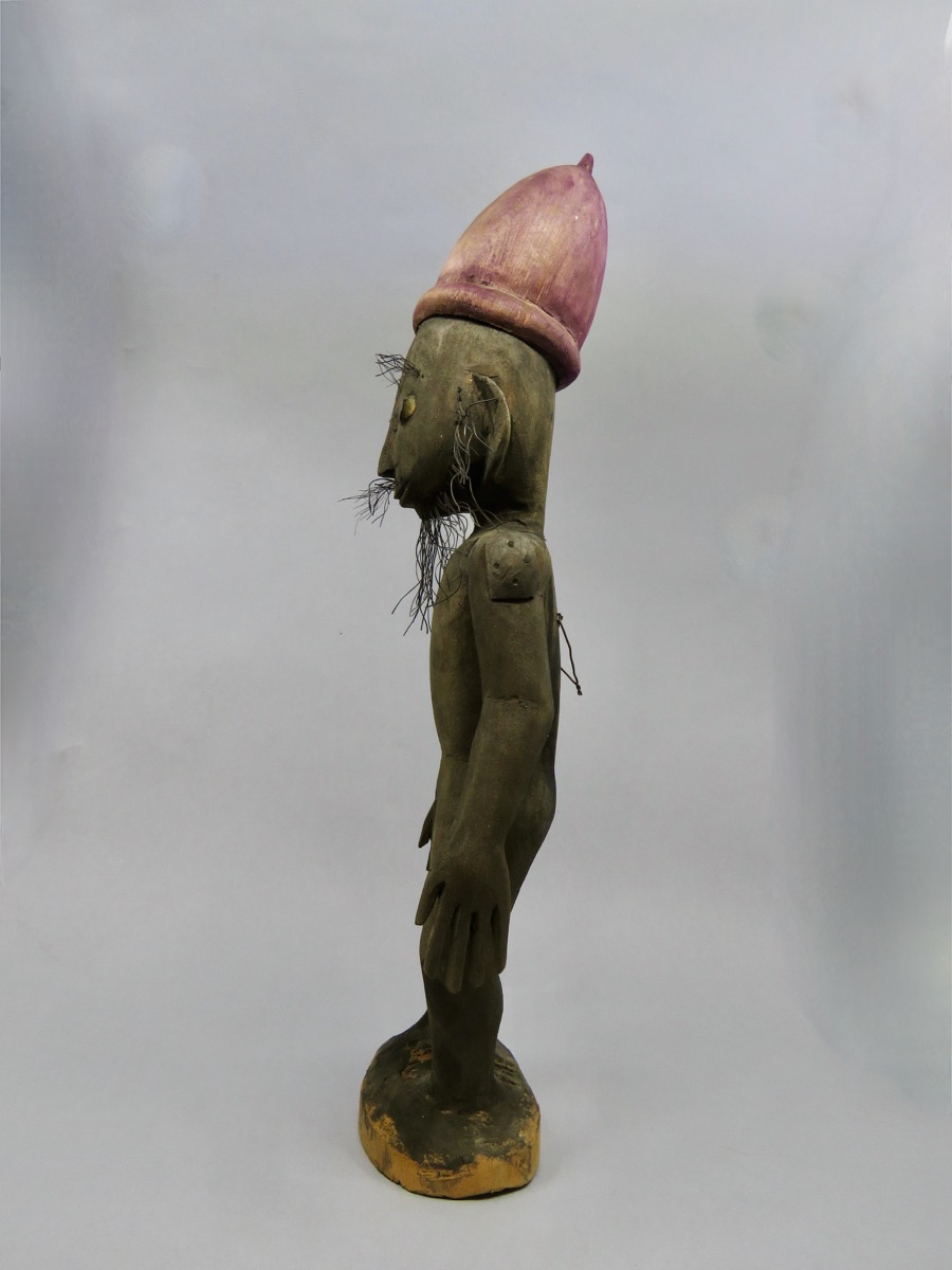A Jin Itam. Dark wooden human figure with a maroon/red colour pointed hat (of wood), decorated with ?plant fibre beard and hair. The figures eyes are plastered with unknown but shiny red materials; the left eye is slightly peeled off. The arms are movable from the shoulder joints. The figure stands steadily on their own.