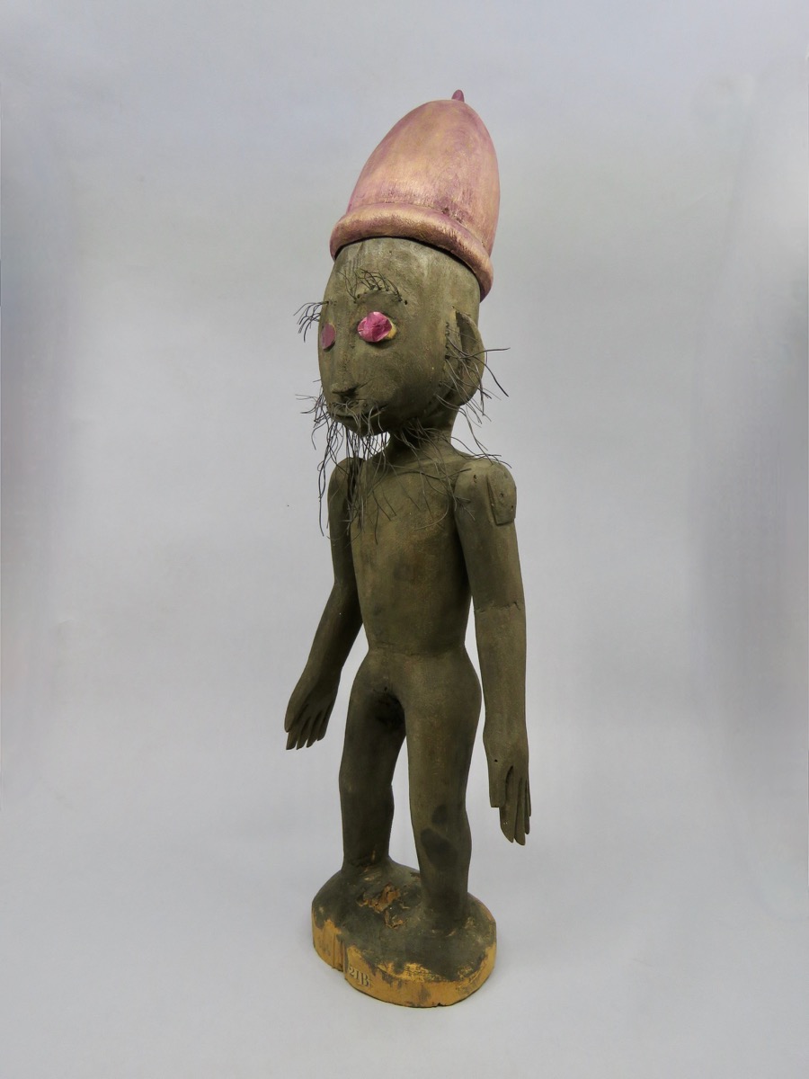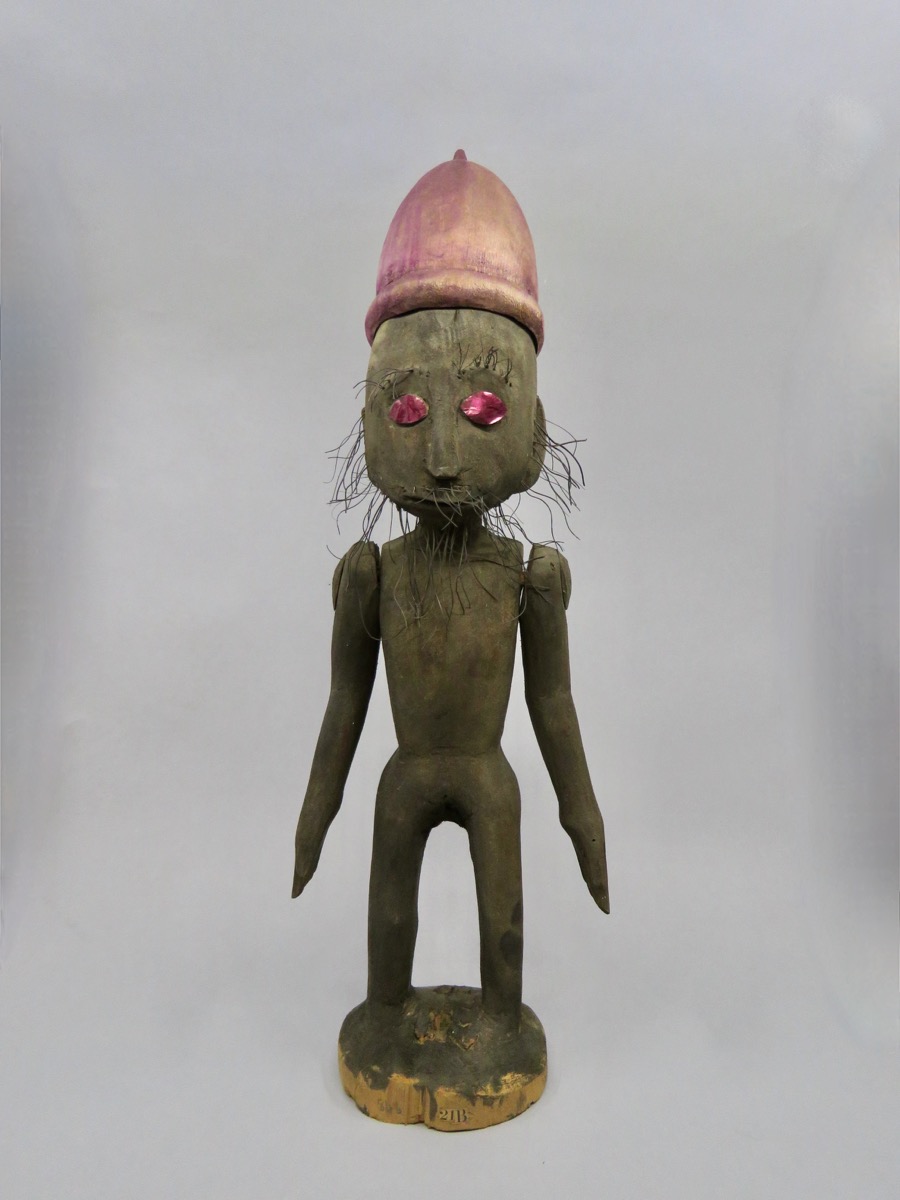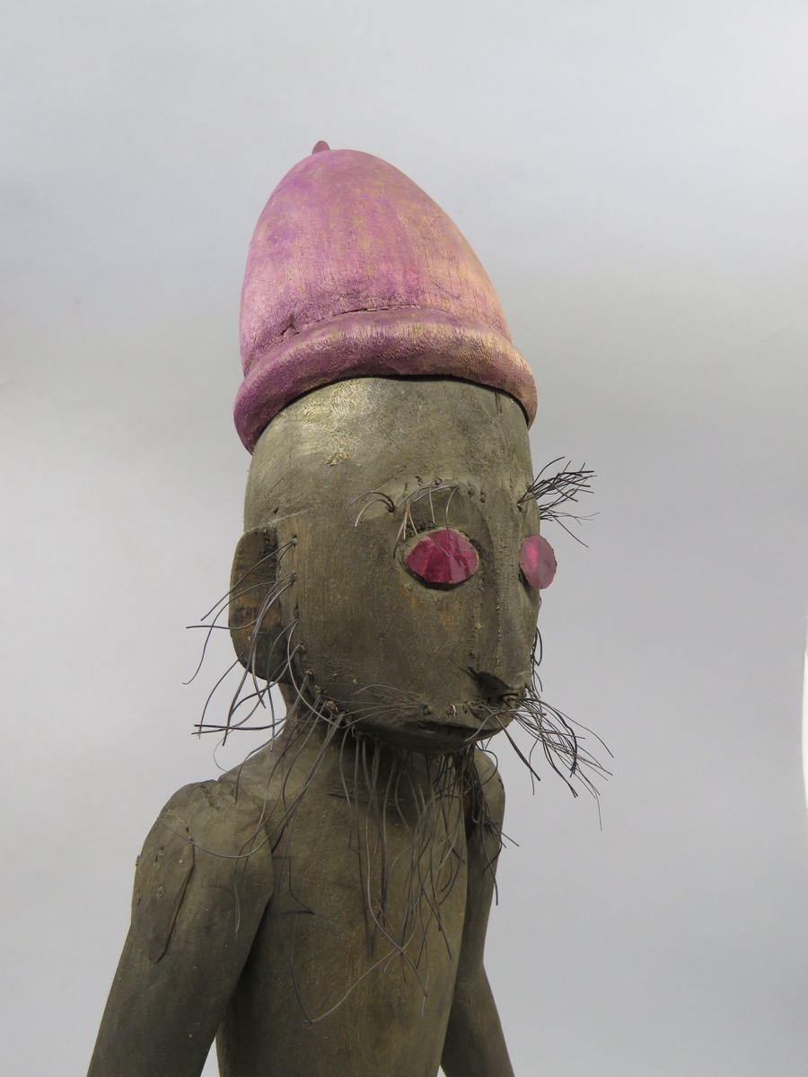 A Jin Itam. Dark wooden human figure with a maroon/red colour pointed hat (of wood), decorated with ?plant fibre beard and hair. The figures eyes are plastered with unknown but shiny red materials; the left eye is slightly peeled off. The arms are movable from the shoulder joints. The figure stands steadily on their own.