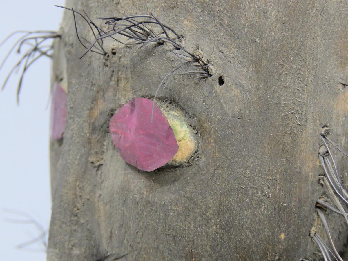 Jin Itam. The Black Djinn. Dark wooden human figure with a maroon/red colour pointed hat (of wood), decorated with ?plant fibre beard and hair.