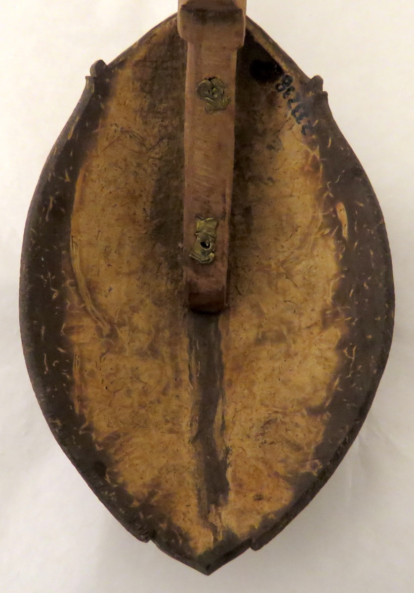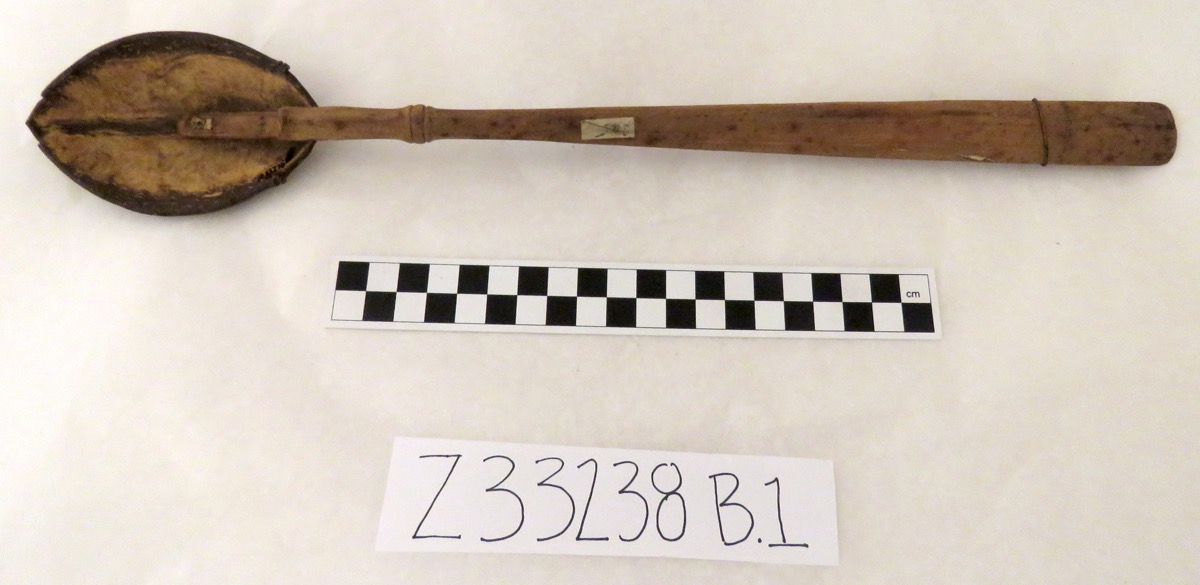 Wood and coconut shell spoon, with a brown wooden handle and a dark and light brown coconut ladle. The handle is nailed to the ladle part with nails made of copper alloy, which is slightly corroded on the back of the ladle. The handle is decoratively carved, on the end nearest the ladle. The ladle's edges are carved decoratively to match the handle.