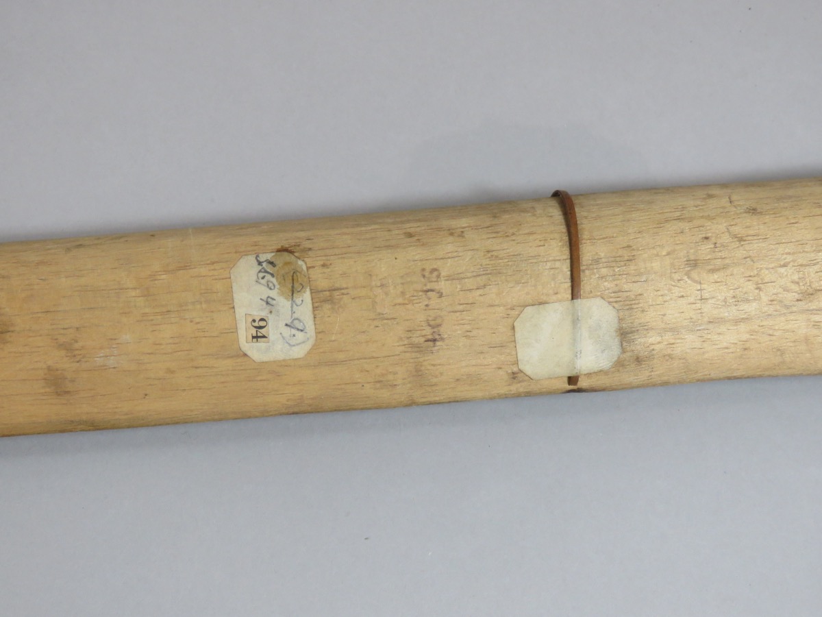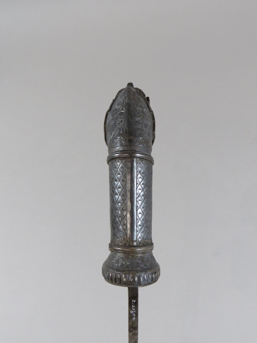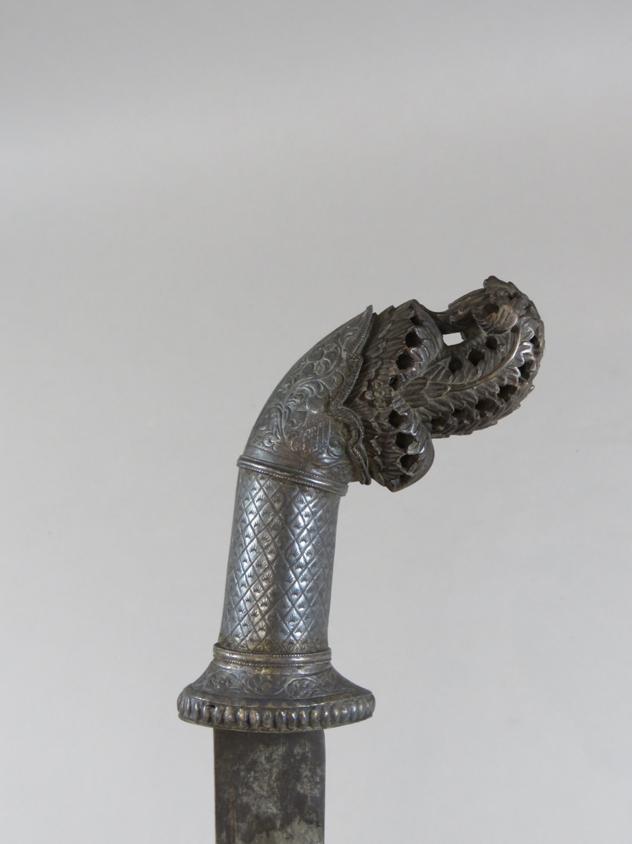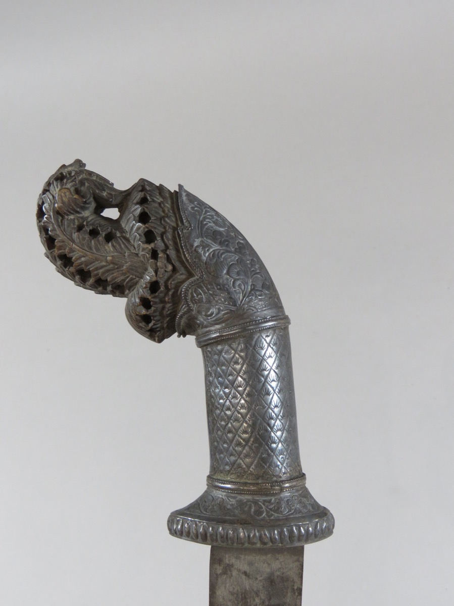 One edged sword with prooved blade and decorated hilt of wood and chased silver representing the conventionalised foliate dragon's head.
