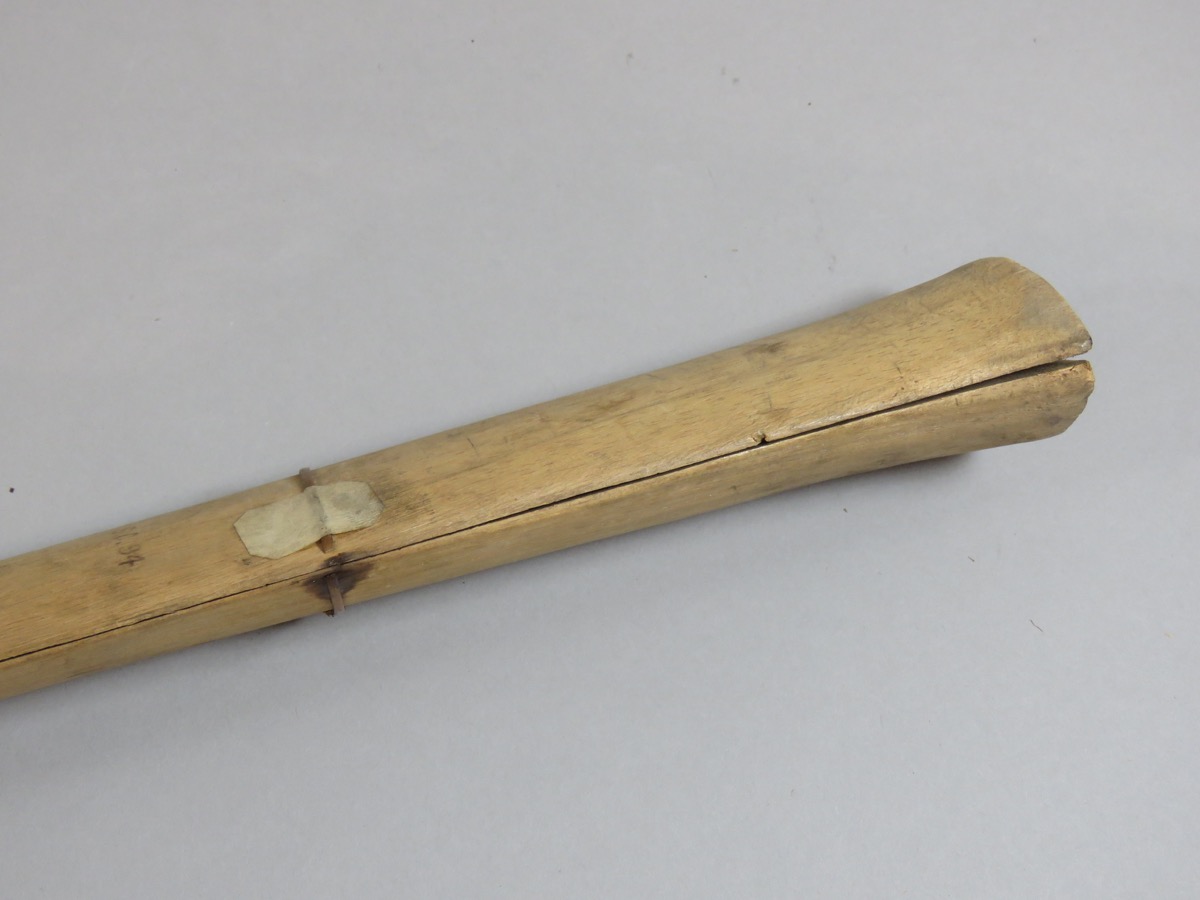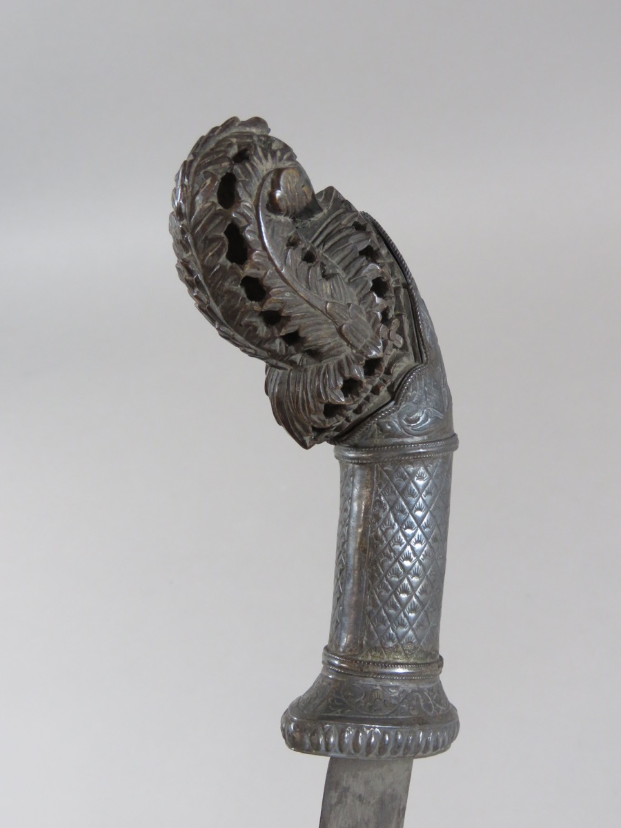 One edged sword with prooved blade and decorated hilt of wood and chased silver representing the conventionalised foliate dragon' s head