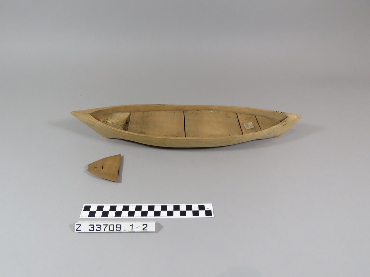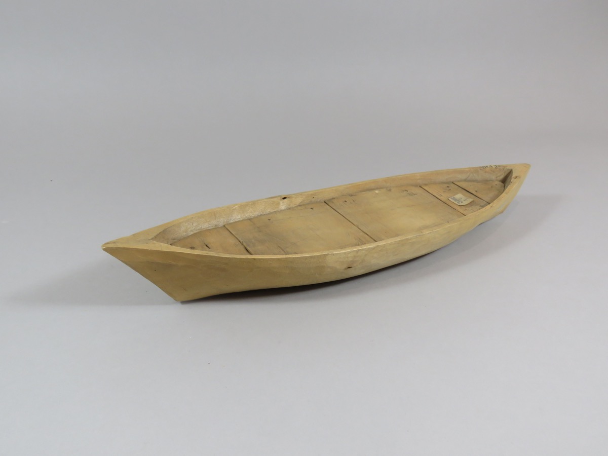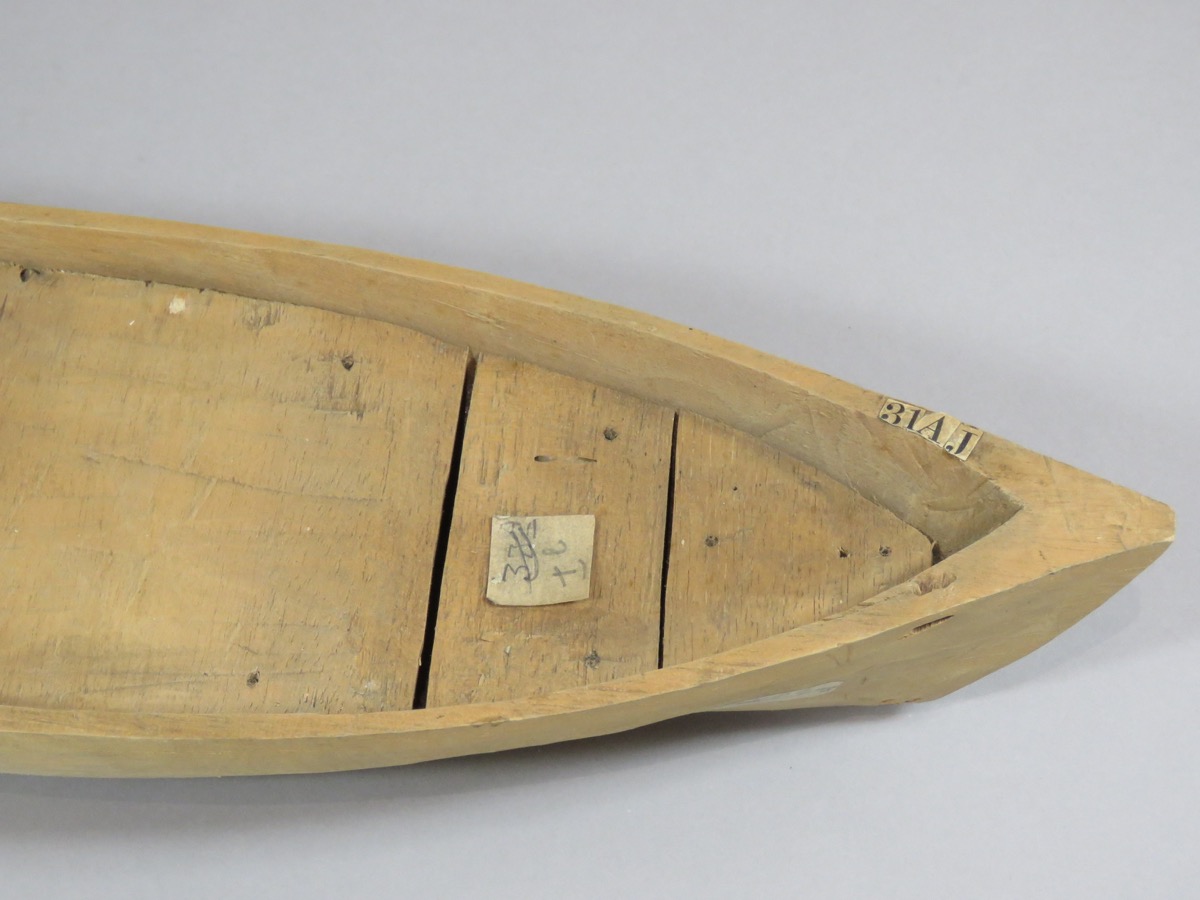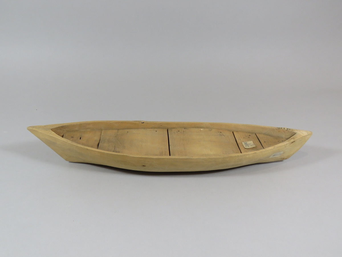 Model wooden dug out paddle canoe or boat, (.1) Champlong. Flat bottomed with sharp stern, and full decking boards. One of the end deck boards is detachable, the others are nailed securely down (.2).