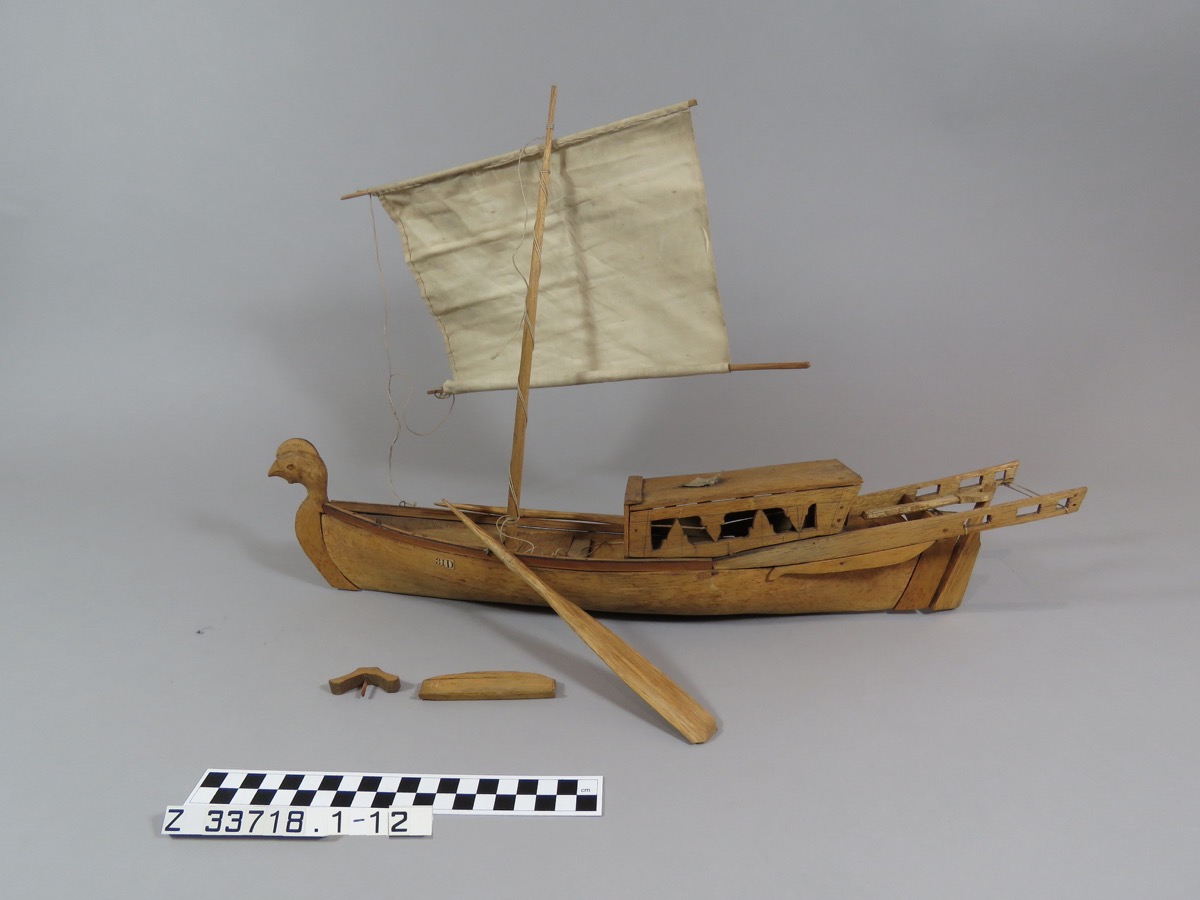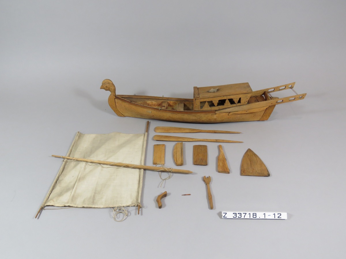 A single-masted wooden model Prahu ayam with cockerel's head prow, and deck house decorated with meru designs (sacred mountain) or stylised foliage and bamboo shoots. Rectangular pieced railings 'dandan' over the stern. Detached mast with rectangular cotton cloth sail (.2) Rudder detachable and secured with pins (.3). Two detached sweeps or oars (.4-5) but no separate steering oar present. Three desk boards detached (.6-8) and a curved element with wooden pin at base (.9-10) of unknown use; and a strut with U-shape at top, resembling an oarlock and possibly for a steering paddle (.11). The location of a rectangular board with a curved top, and two in holes in the base cannot be located on the model (.12).