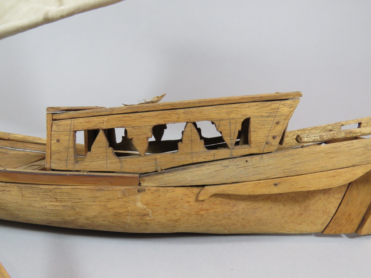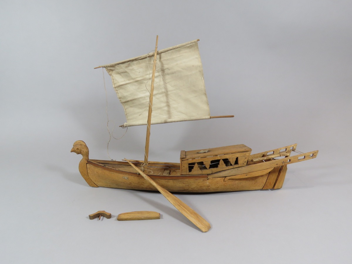 A Prahu ayam. A single-masted wooden model with cockerel's head prow, and deck house decorated with meru designs (sacred mountain) or stylised foliage and bamboo shoots. Rectangular pieced railings 'dandan' over the stern.