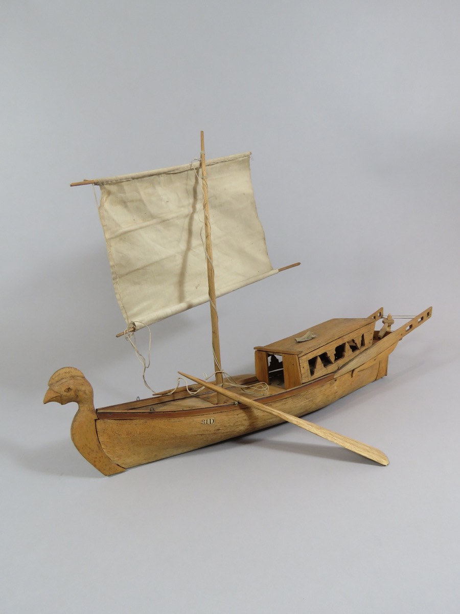 A Prahu ayam. A boat model similar to Z 33717, but of slimmer build: carries dandan over stern only and has a steering oar. Cock's head on bow.