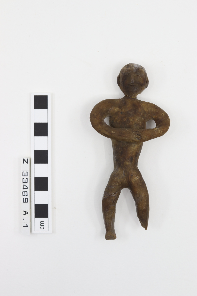Wax human figure. Arms embraced in front of chest. One leg broken off.