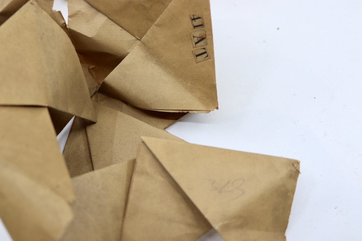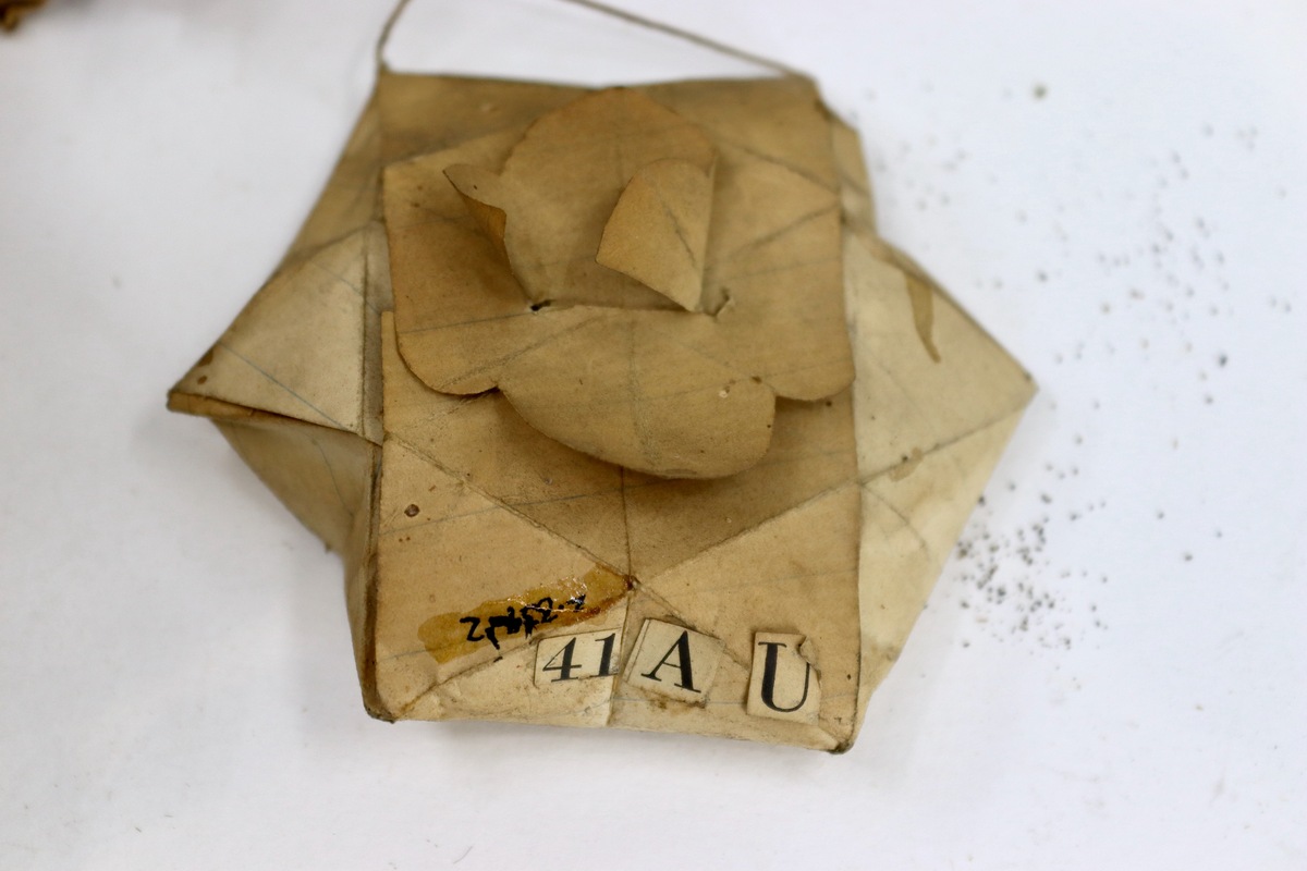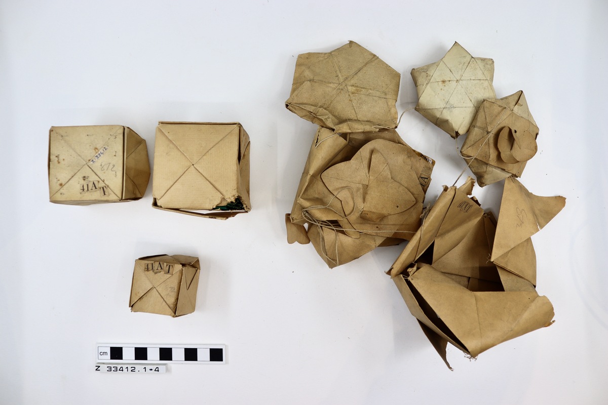 Eight paper boxes, four cubic and four hexagonal, made through intricately folding procedure. Five boxes are strung on one string (.4) and three are independent (.1-3). One of the cubic box contain green folded cloth (uncertain), and two hexagonal boxes contain unknown substances.