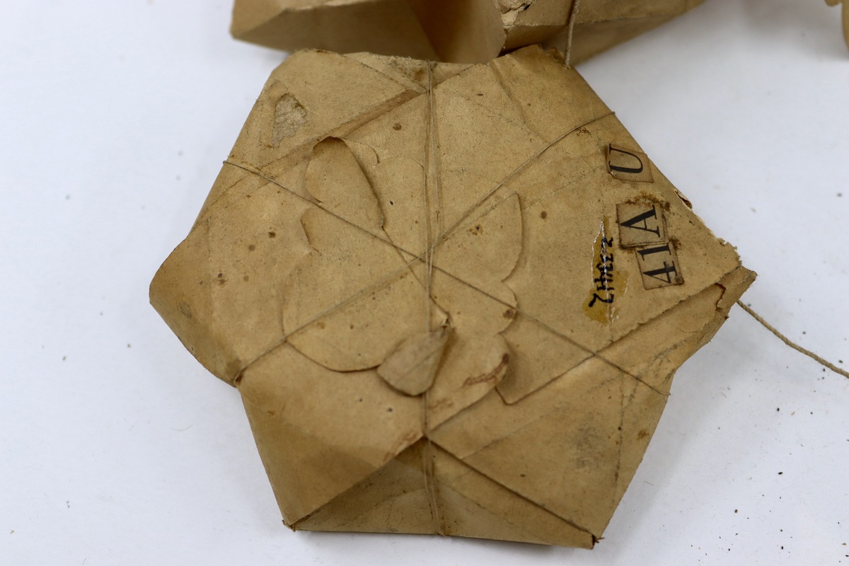 Four old printed paper labels pasted on the four hexeagonal boxes individually, reads '41 AU'. Author and date unknown.